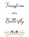 Inspirational quote about life in a bold and beautiful: "Transform into a Butterfly..." With a beautiful butterfly border on the bottom of the printable.