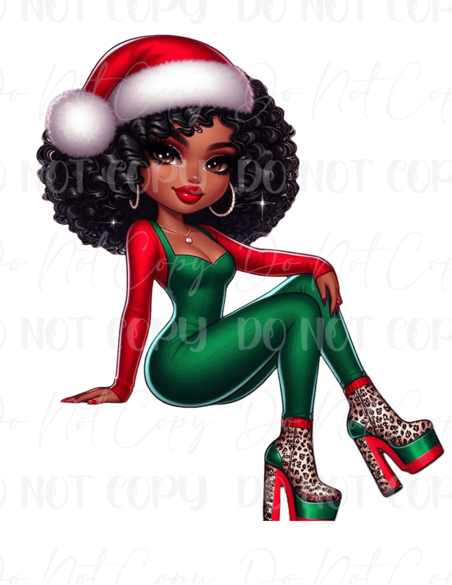 Meet Santa Baeβthe ultimate holiday diva who's bringing style and sass to the season! Dressed in a sleek green jumpsuit with festive red sleeves, she pairs her look with fierce leopard-print platform heels and a classic Santa hat for that perfect touch of Christmas glamour. With her bold curls, hoop earrings, and confident pose, she's ready to slay (and sleigh!) all season long.