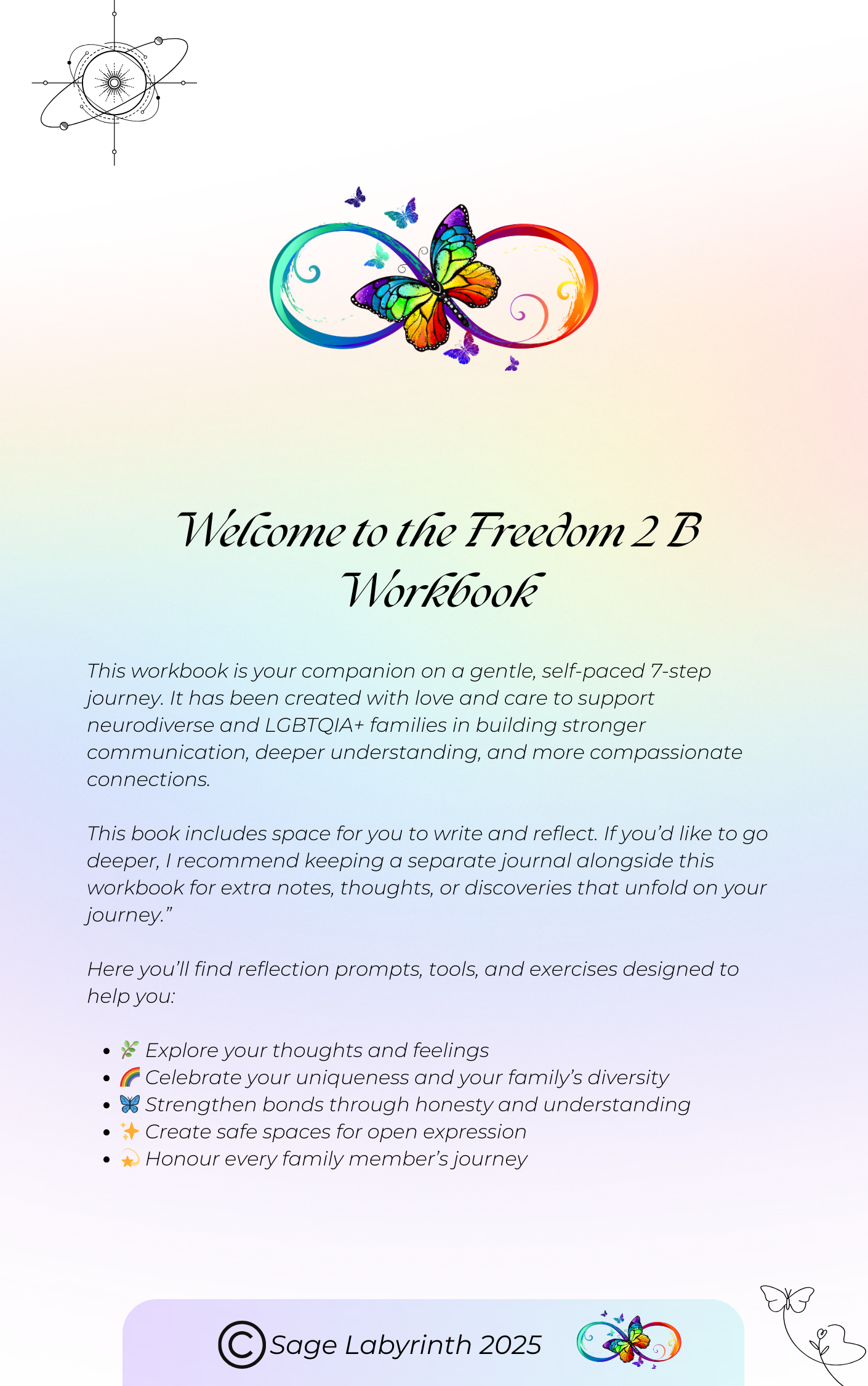 The Freedom 2 B Workbook is a gentle, self-paced guide designed to strengthen family bonds while nurturing your own wellbeing. Whether you’re seeking clarity, balance, or a fresh way forward, this workbook gives you space to reflect, grow, and rediscover the freedom to be authentically you.