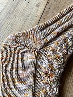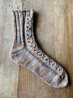 The Pumpkin Farm socks are written for magic loop toe-up, but the stitch pattern can be transferred onto a top-down sock very easily. Just insert the chart pattern onto the front side of the leg and foot of a cuff-down sock.