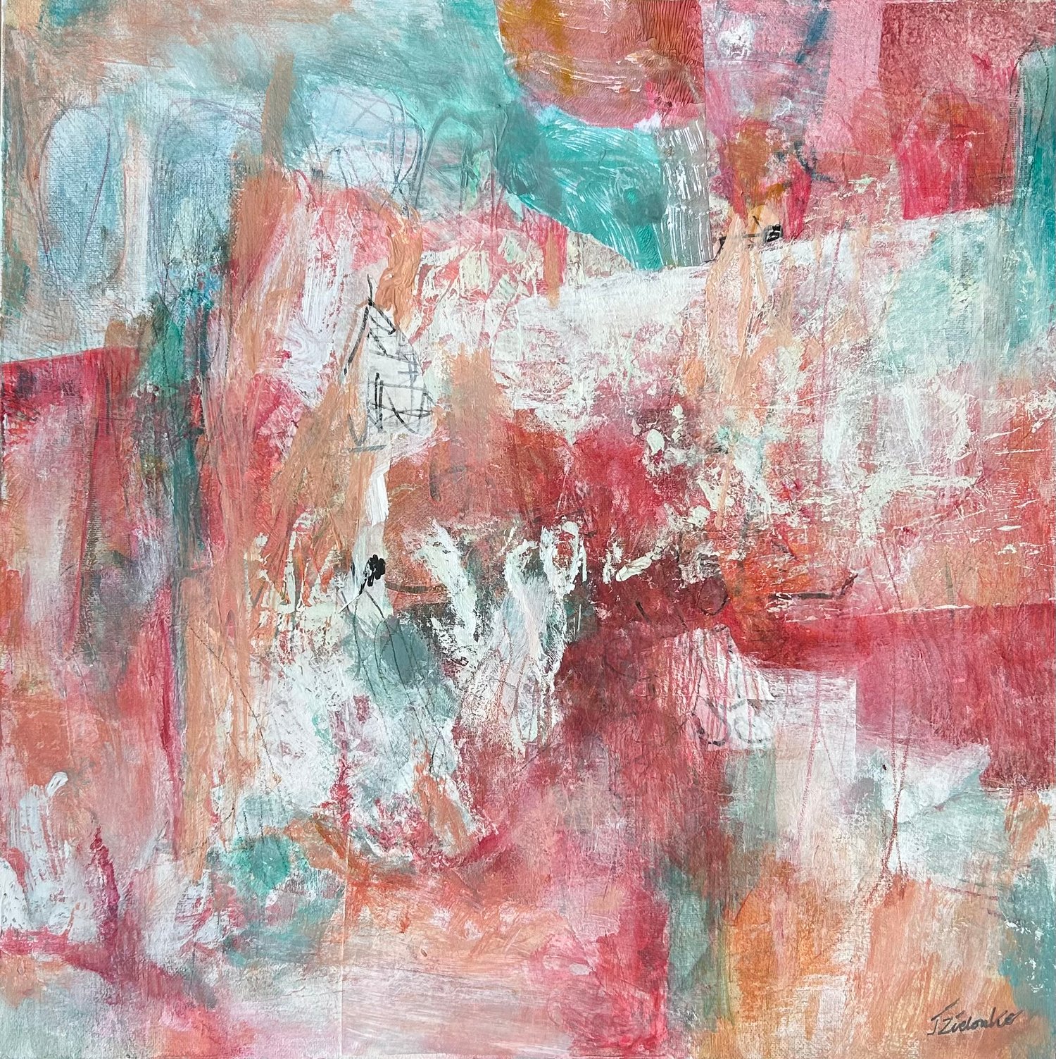 Les tonalités rouge, rose et turquoise dialoguent dans une matière vibrante, laissant apparaître des signes discrets, presque effacés.