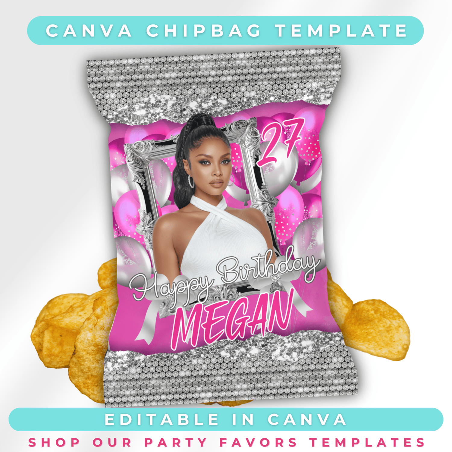 Editable Birthday Chip Bag Template | Pink & Silver Glam Canva Design | Custom Printable Party Favor for Women | Digital Download, DIY Event