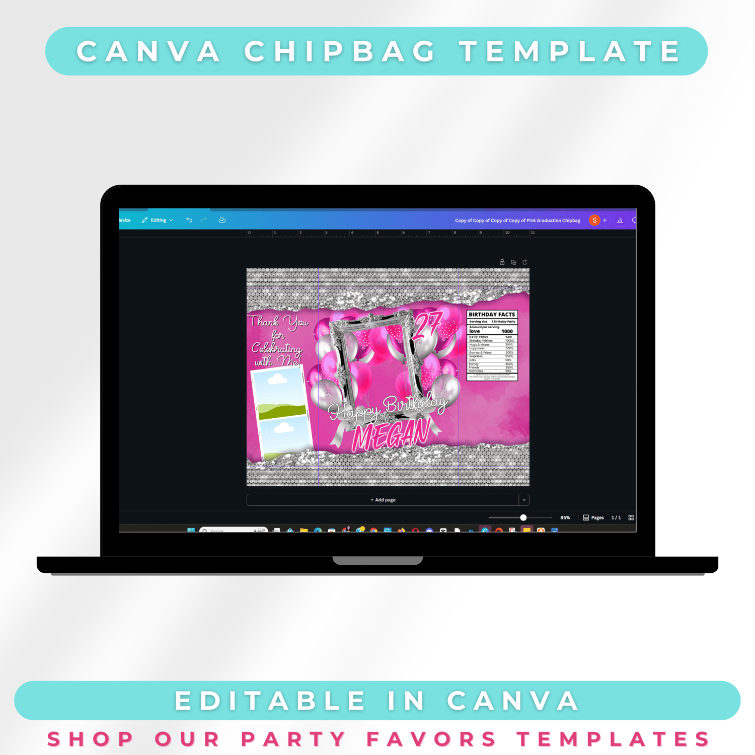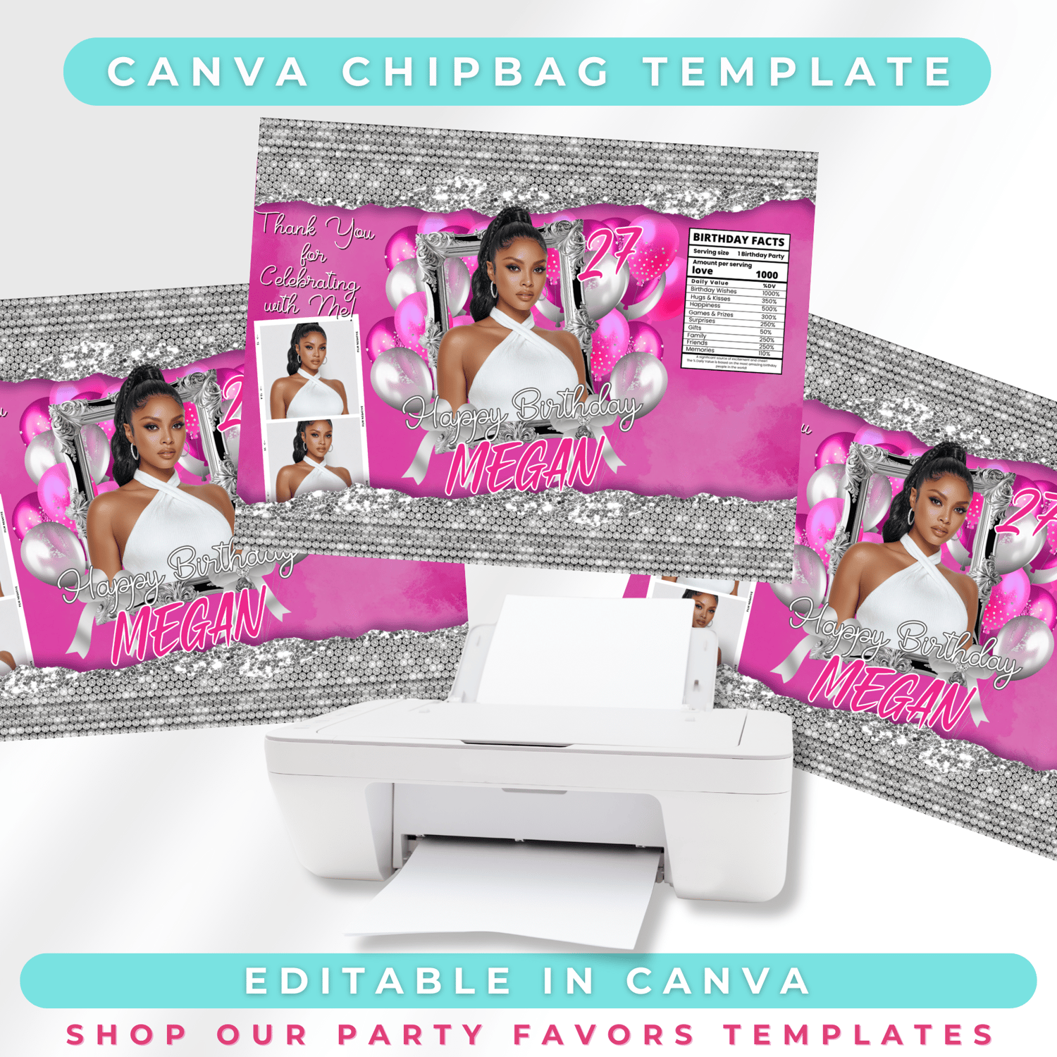 This Editable Canva Chip Bag Template is the perfect party favor for any glam birthday queen. With a stunning silver glitter border, soft balloon background, and a chic illustrated birthday girl front and center, this pink + silver design is made to pop—just like your party ✨
