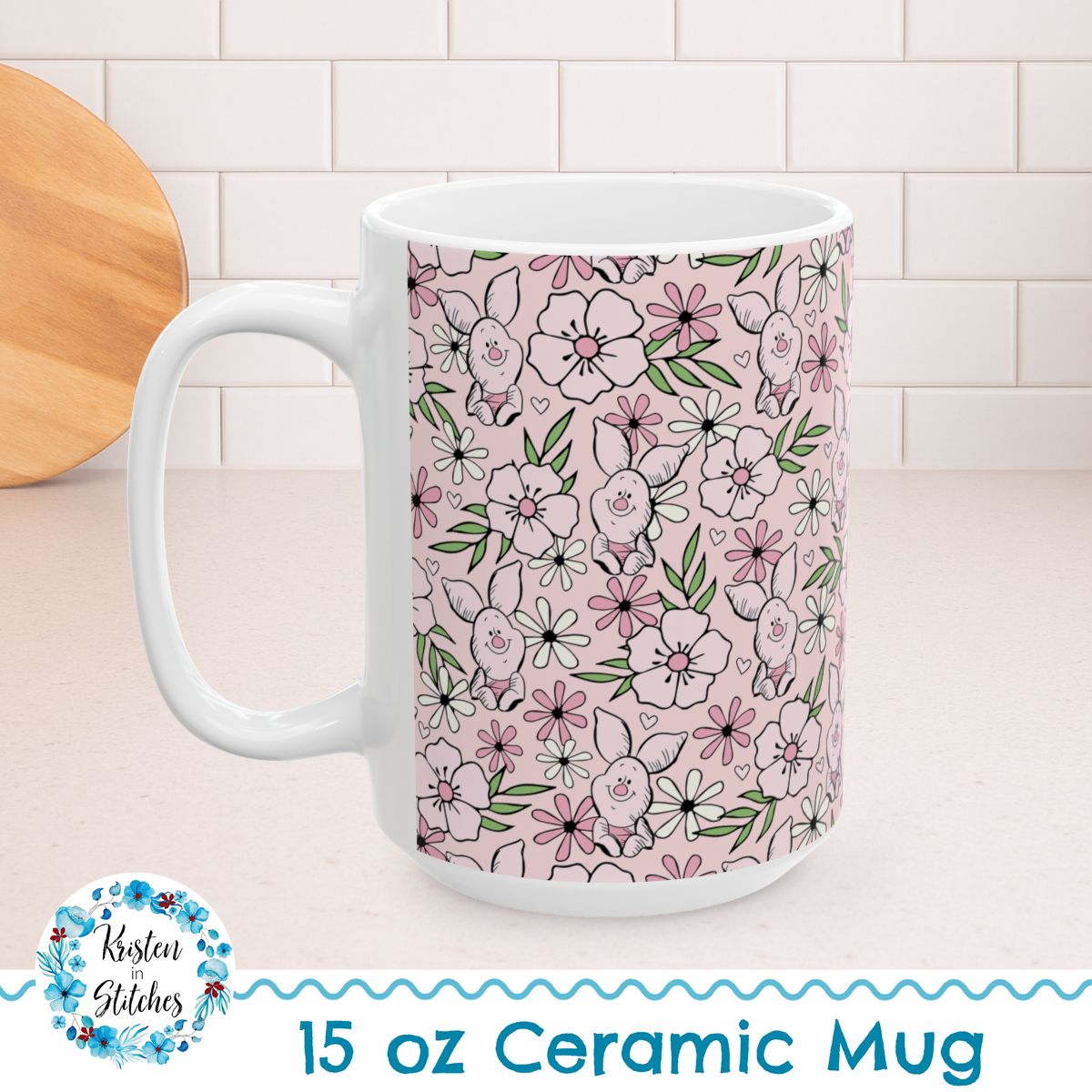 Piglet Floral 15oz Ceramic Mug, Large Coffee Cup, Classic Winnie the Pooh