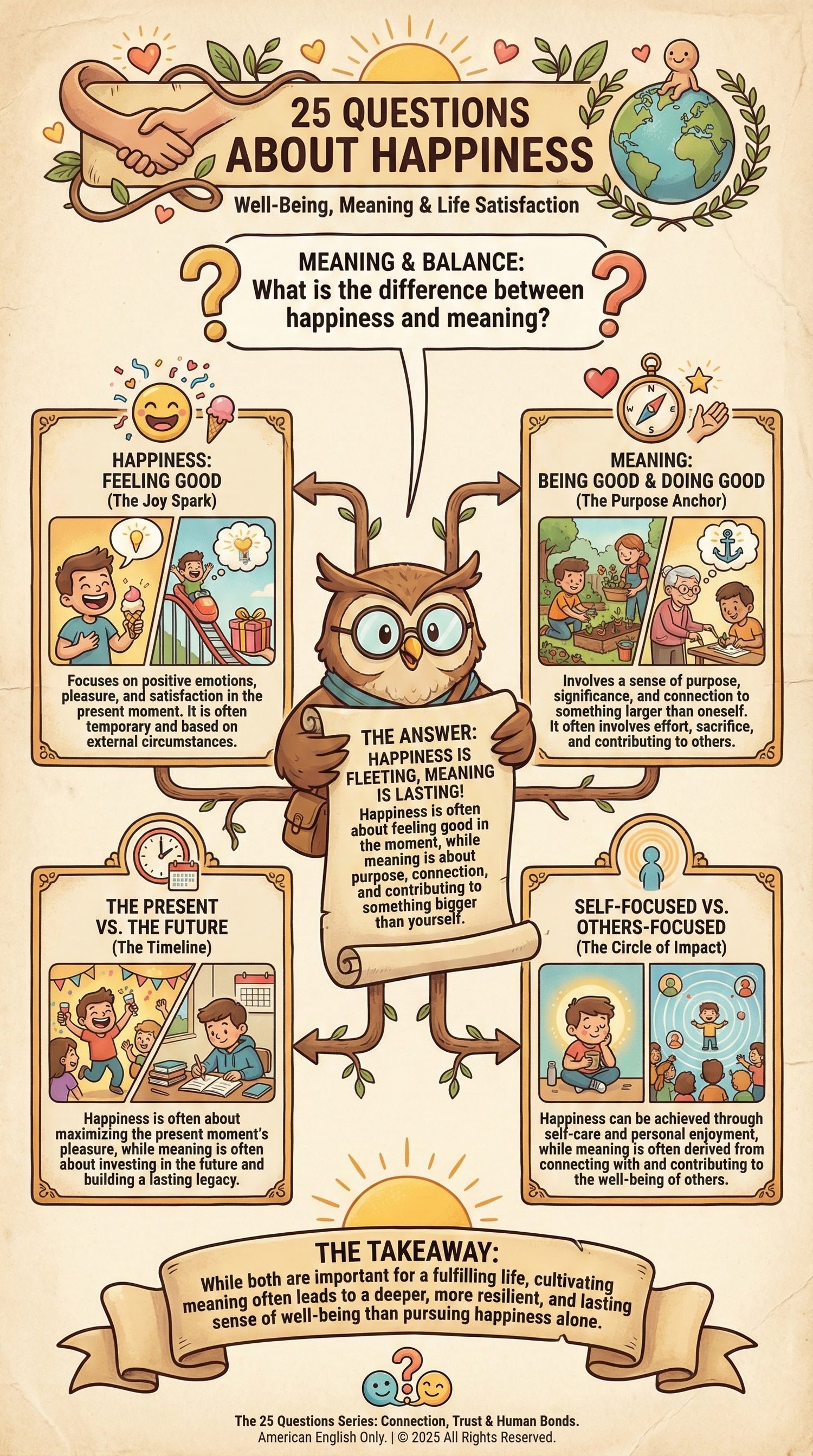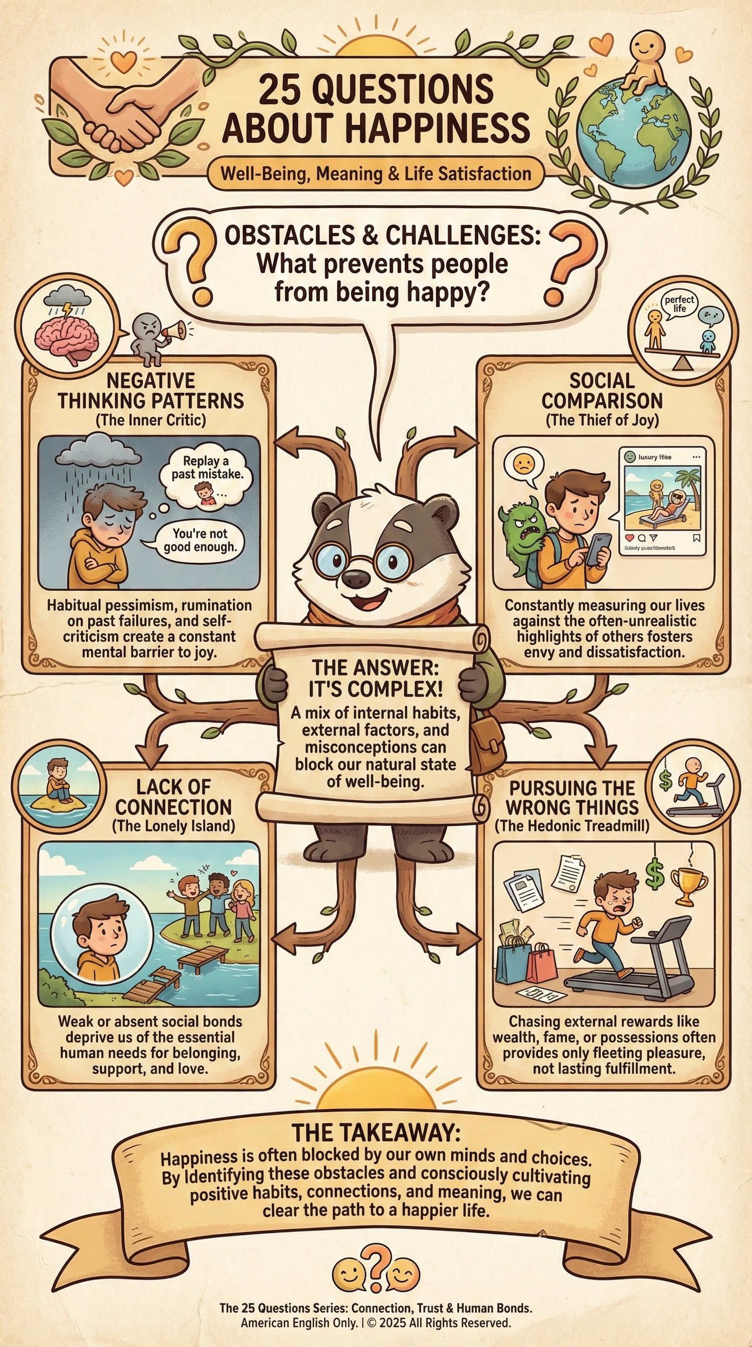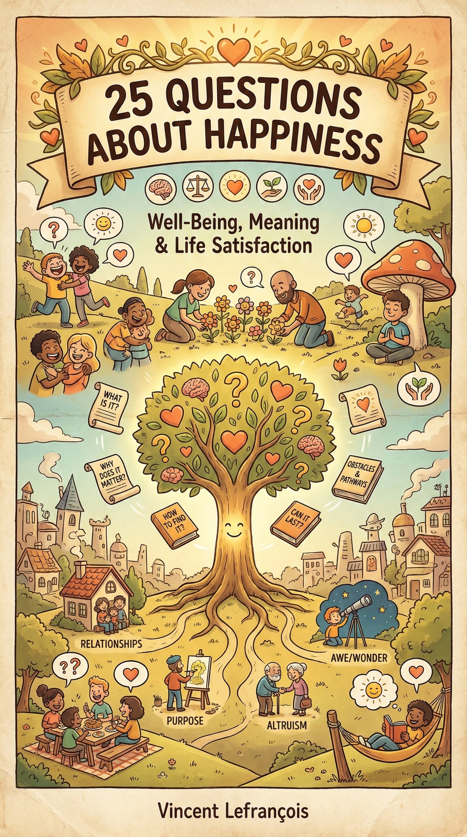 25 Questions About Happiness is a beautifully illustrated educational book that explores how humans experience happiness, what influences it, and why it is often more complex than it seems.