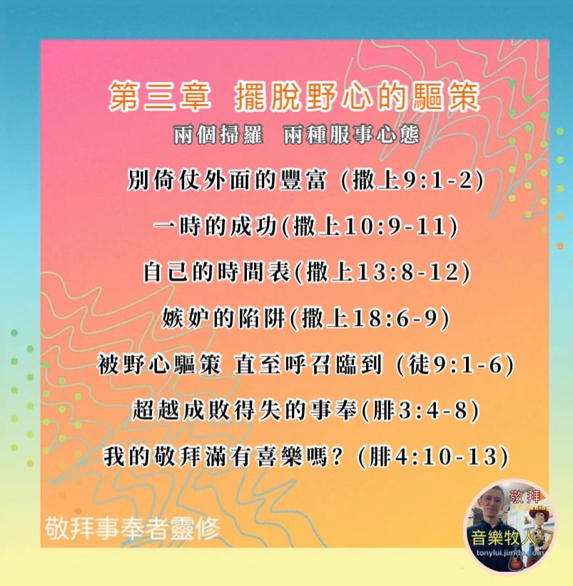 作者呂兆樑傳道(Tony, 音樂牧人) 希望從事奉者的需要出發,同時建構一套敬拜事奉的神學。個別每章有比較針對個人,也有針對團隊與群體的。