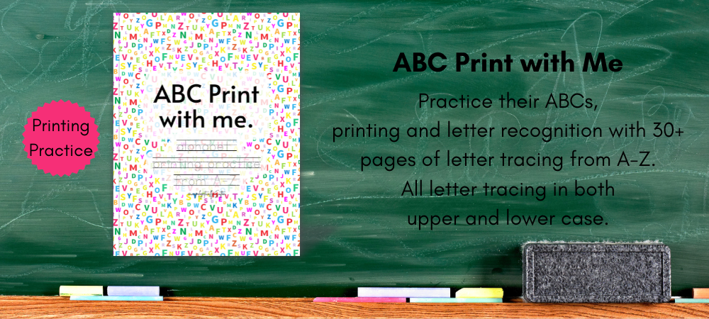 Printing from A-Z, with a page dedicated to each letter of the alphabet as well as pages of the full alphabet. Children can practice reciting their ABCs while working on their printing.