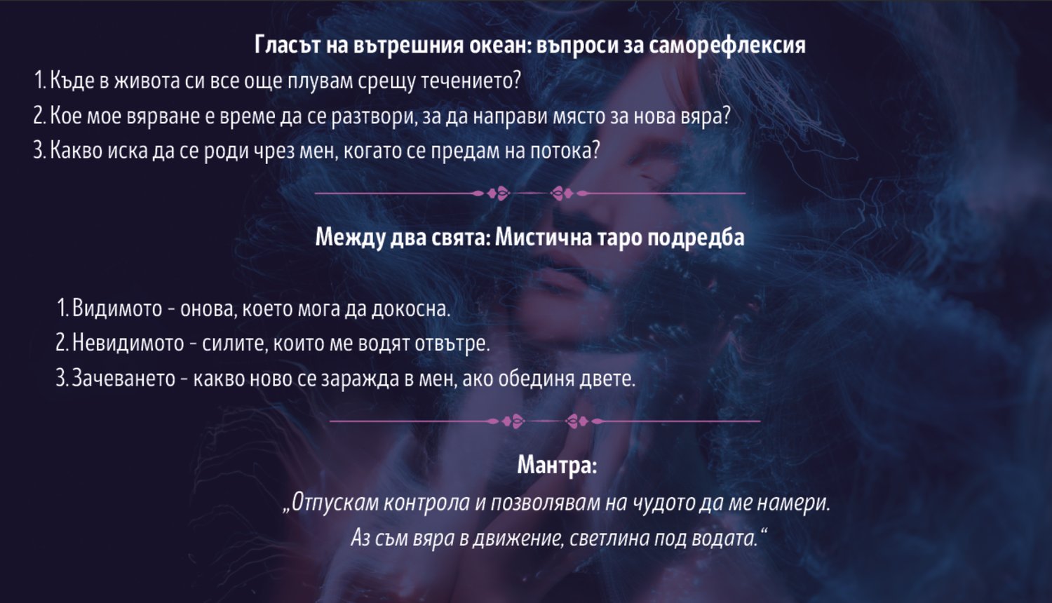- Ритуали за отпускане, освобождаване и доверие в живота.
