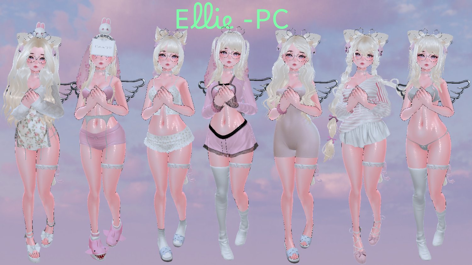 - dress, cardigan, sweater, jumpsuit, frilly tank top, pj top, eepy top, eepy bra, frilly shorts, skirt, shorts, pj shorts, bra/panties, slippers, heels, shark slippers, bow sandals, short socks, thigh highs, 2 different kitty ears, kitty tail, bunny ears, bunny tail, backpack, note, bunny, hair clips, scrunchie, hand kitty, wings, mouth lollypop, rings, leg garter, heart headband, glasses, face bows, earrings, choker