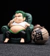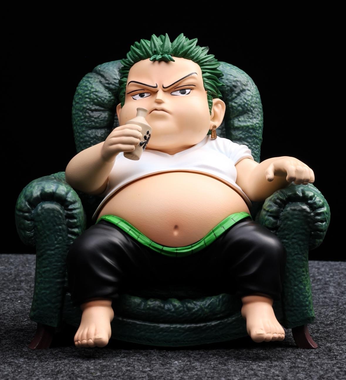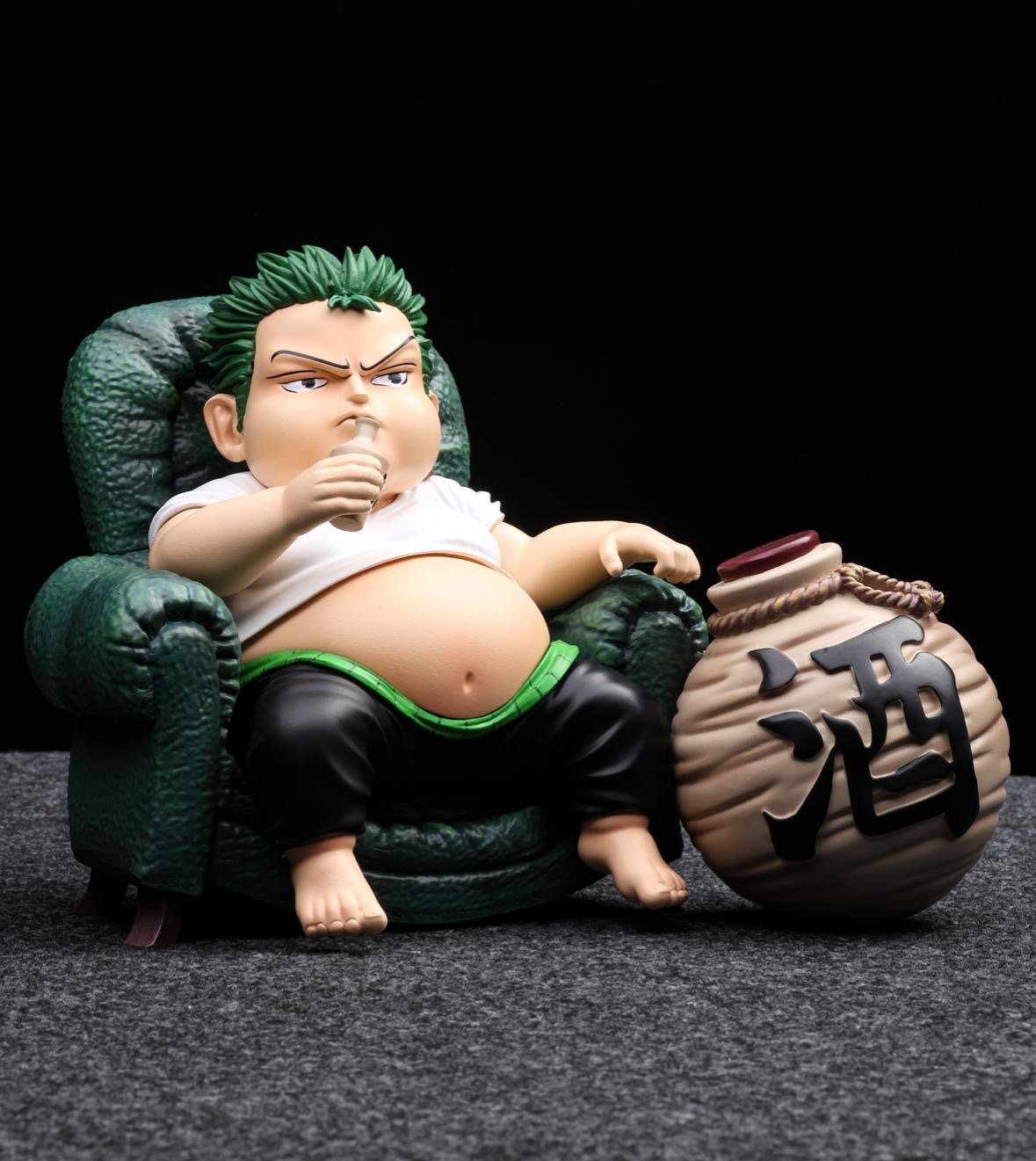 Ready for a laugh? This unique, non-canonical Roronoa Zoro figure captures the legendary swordsman in his funniest, most relaxed state: a lazy couch potato enjoying a big jug of "Sake" (酒)! A perfect, lighthearted addition to any One Piece collection.
