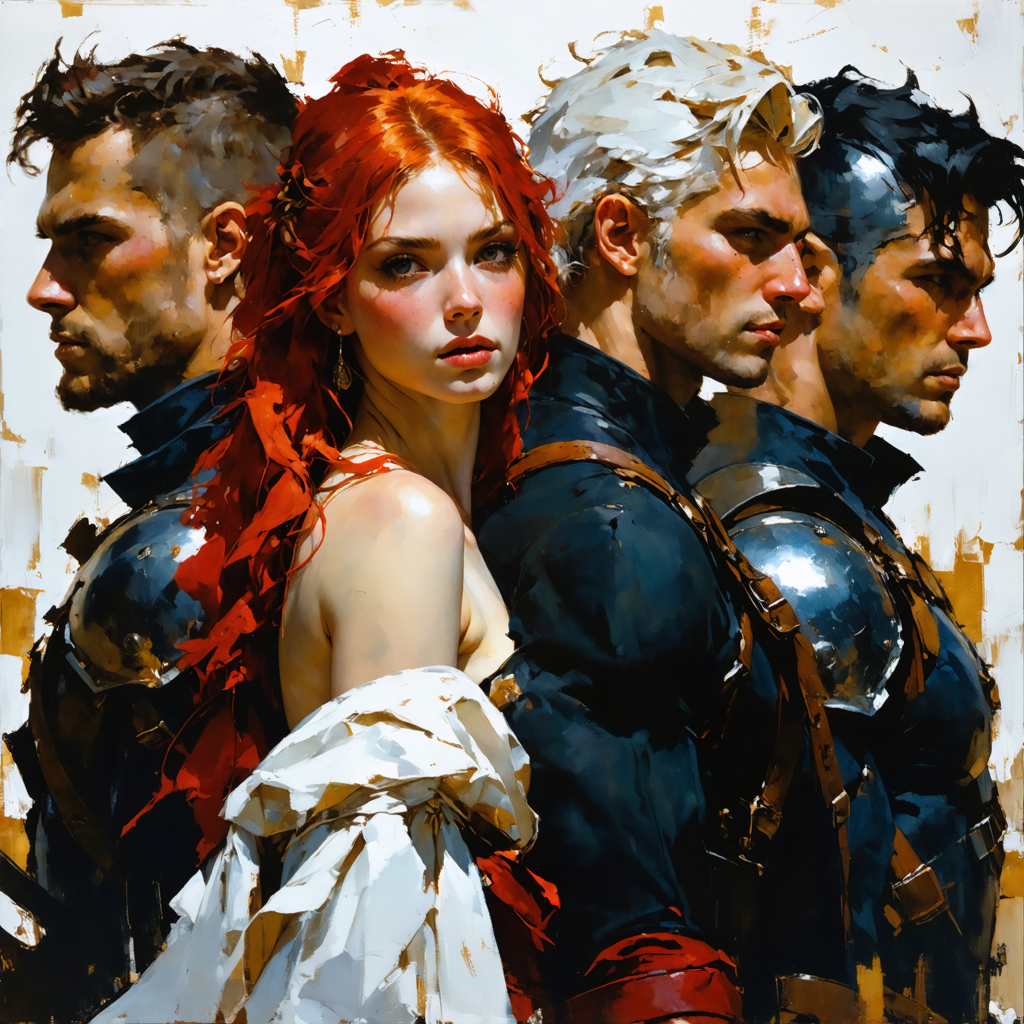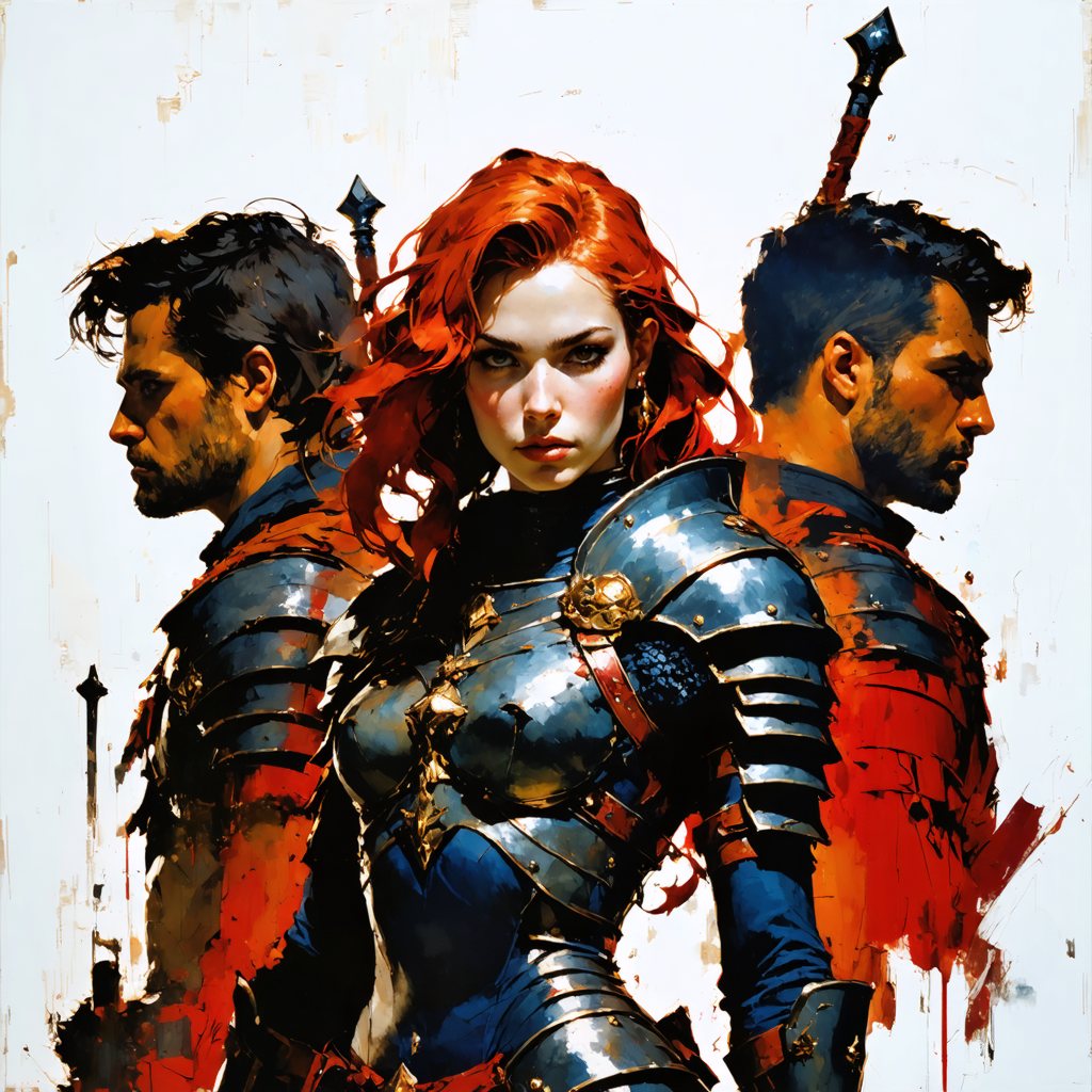 - Light crimson hair, half-body warrior composition