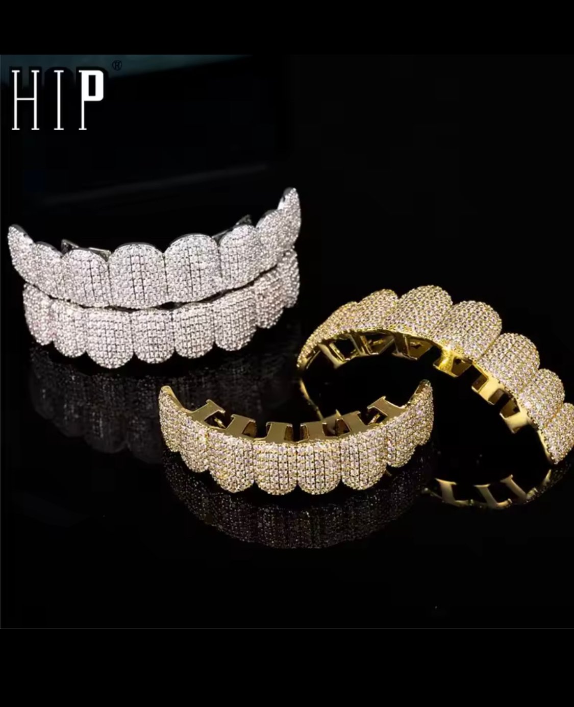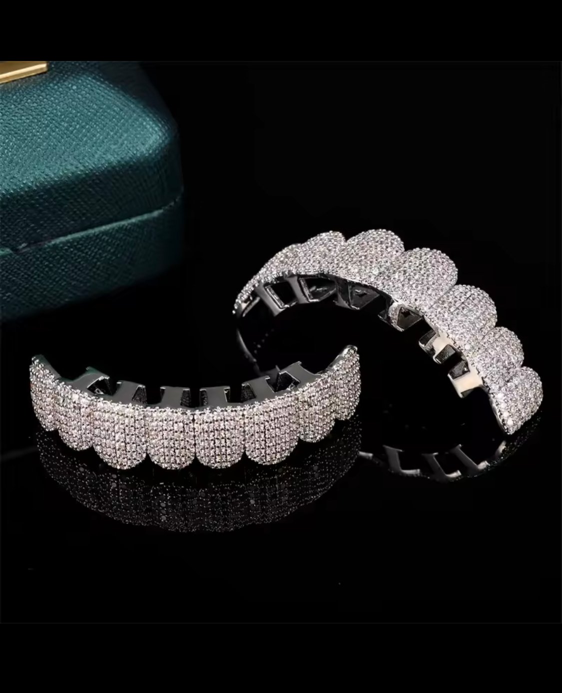 This is a high-impact teeth jewellery accessory: a full cover “grillz” set (top + bottom) designed for unisex use, richly embellished with micro-pavé-set cubic zirconia (CZ) stones for a bold “iced-out” appearance. It emphasizes comfort-fit and full coverage of teeth enamel for a dramatic fashion/hip-hop aesthetic.