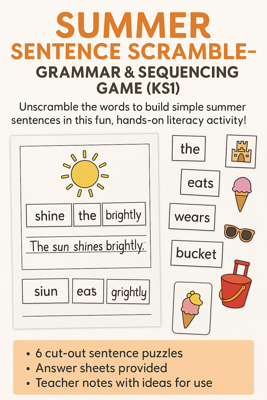 Tags: sentence scramble, grammar, sequencing, summer, KS1, EAL, literacy, sentence building, printable