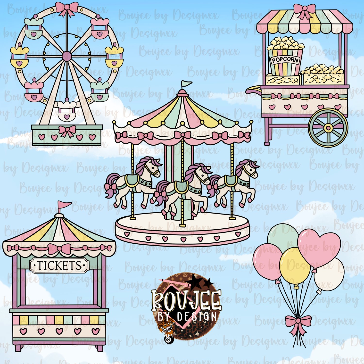 Pastel Fair Clipart Bundle PNG | Ferris Wheel, Carousel, Popcorn Cart, Ticket Booth, Balloons | Carnival Clipart | Cute Pastel Fair PNG