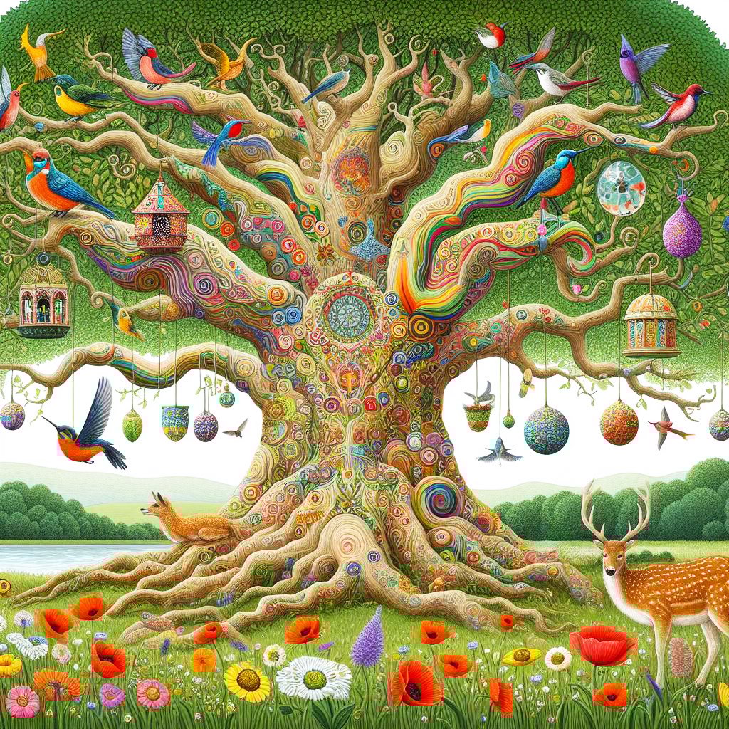 A big old oak tree, with elaborate colourful patterns throughout. It has deep roots & curly branches with green & blue leaves. There is an owl sitting in a hole of the tree. It has beautiful glass bird houses & spinners hanging from its branches. There are colourful humming birds & robins. On the ground there are poppies & sunflowers & the tree is surrounded by a lake. There is a deer lying amongst the flowers.