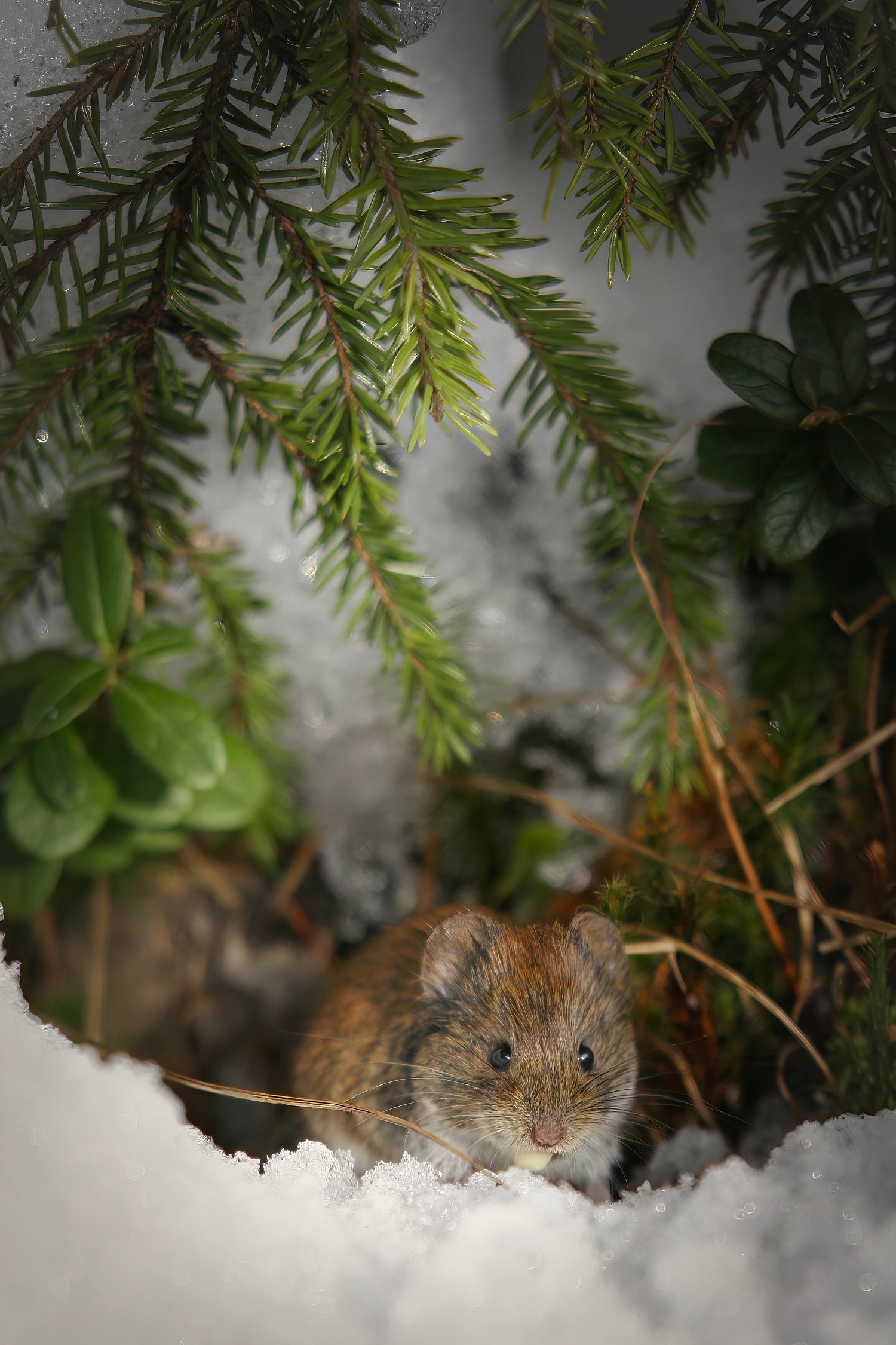 Common Red Backed Vole (Myodes glareolus) has come on top of the snow.