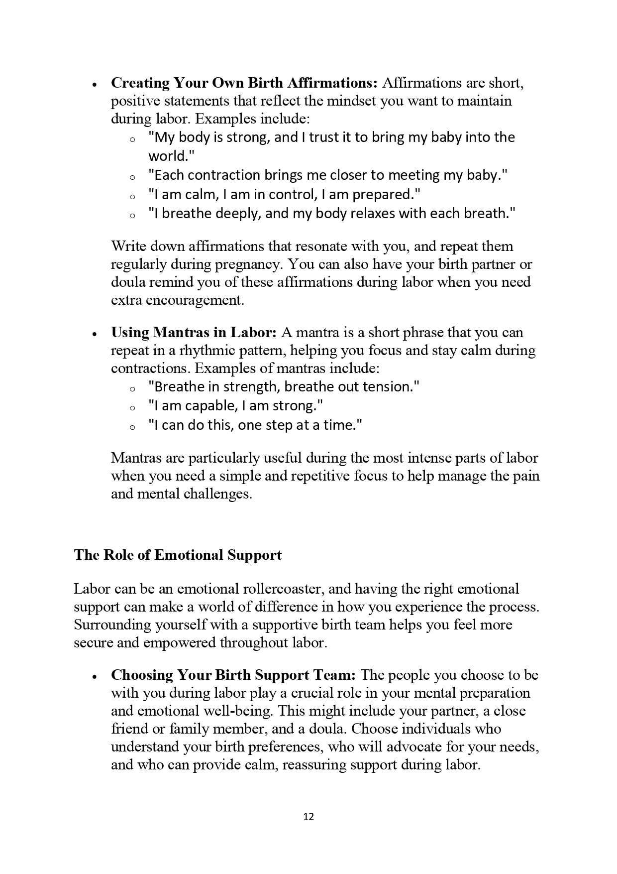 - Mental Preparation: Learn techniques to manage fears and expectations, including visualization, affirmations, and the importance of emotional support during labor.