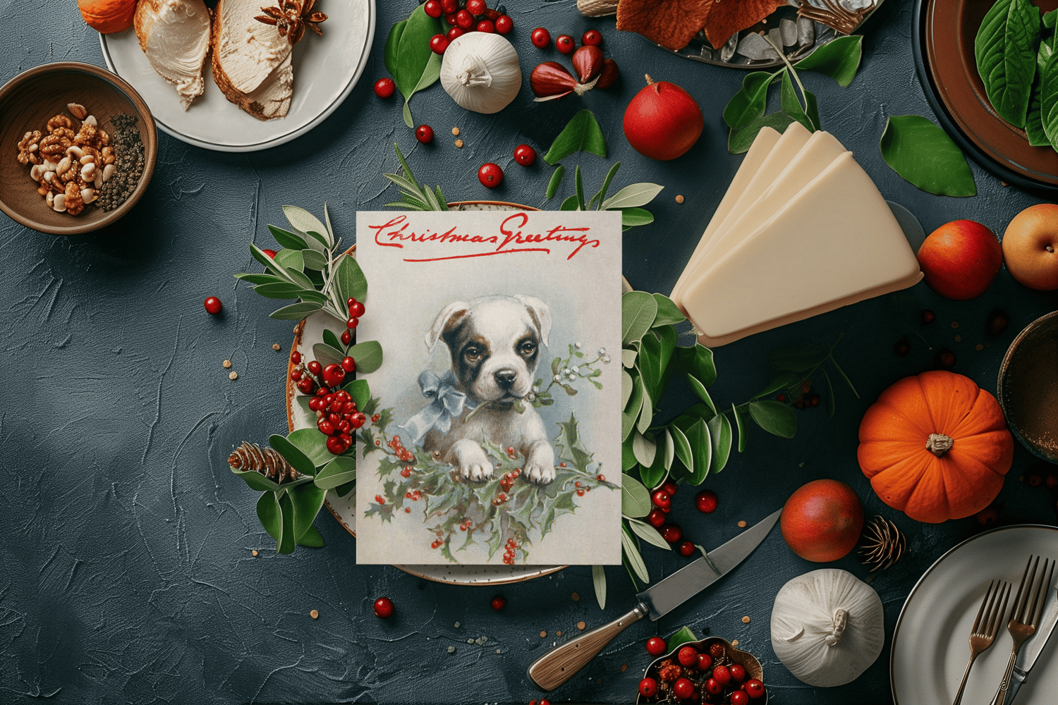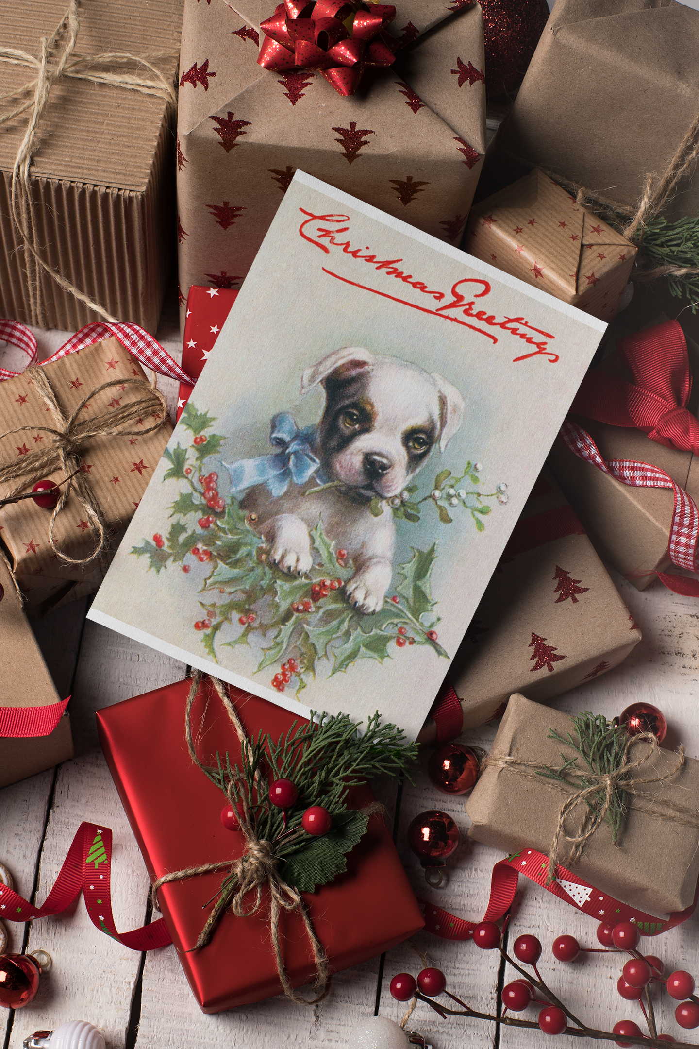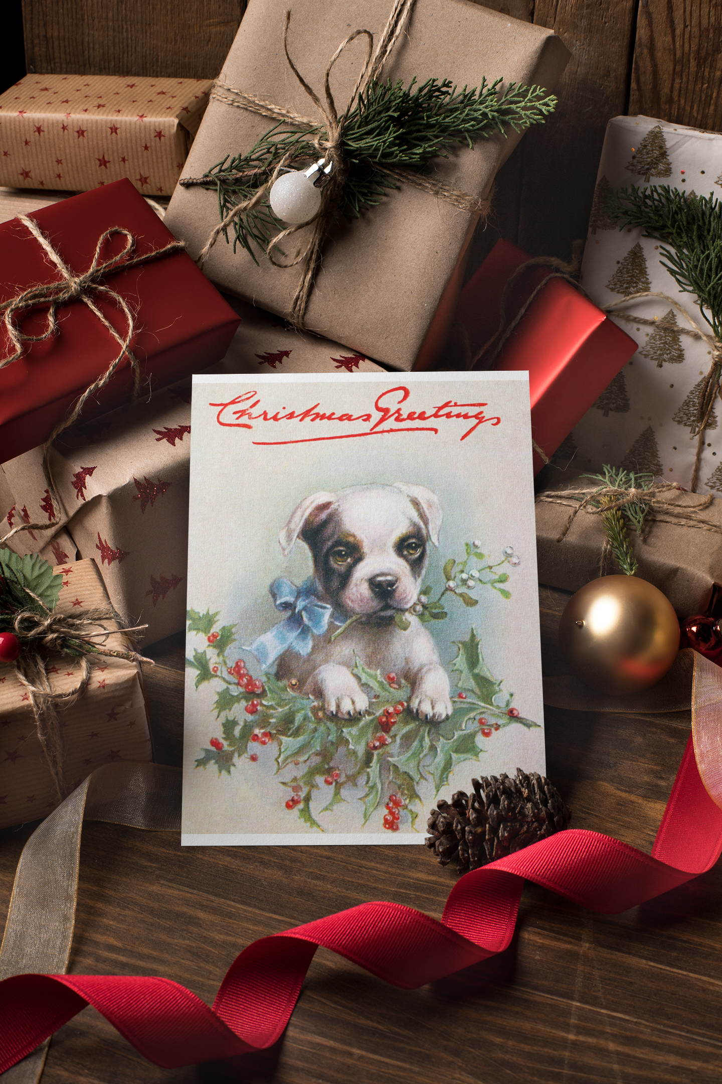 Keywords: vintage Christmas postcard, puppy with holly, adorable holiday greeting, nostalgic holiday card, retro Christmas decor, Christmas puppy illustration, printable holiday art, seasonal scrapbook supplies, classic Christmas postcard, festive gift tag, holiday postcard printable.