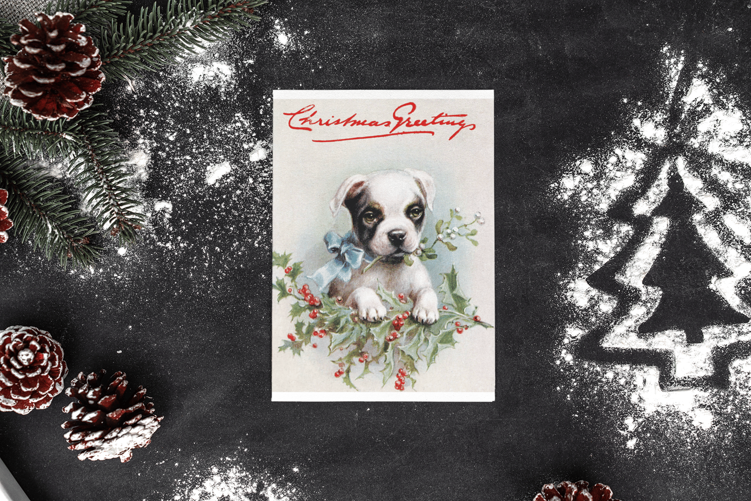 Add a touch of cuteness to your holiday season with this vintage postcard featuring an adorable puppy adorned with a blue bow, nestled among sprigs of holly and berries. The festive "Christmas Greetings" text completes this heartwarming illustration, perfect for spreading holiday cheer. Ideal for holiday-themed projects such as scrapbooking, gift tags, card making, or seasonal decor, this high-quality digital postcard combines nostalgia and charm in one delightful design.