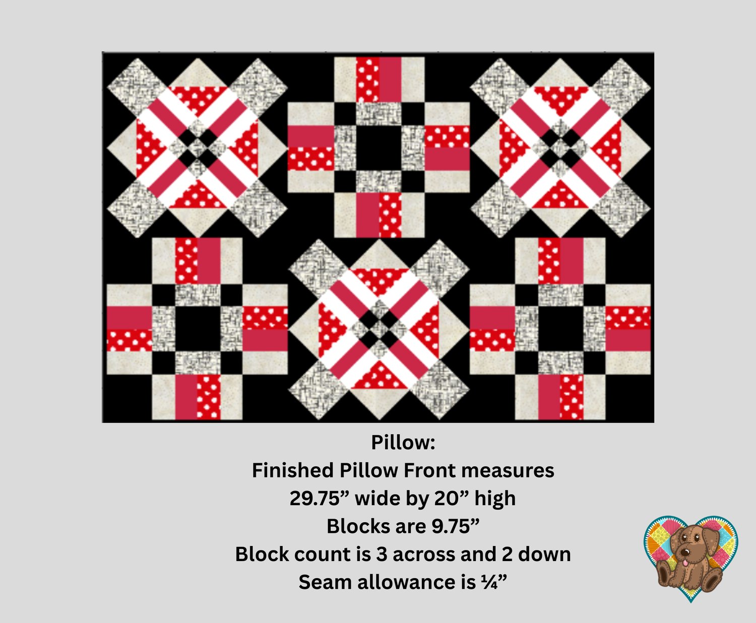 Pillow sham quilt front is 29.75" X 20" Blocks are traditional pieced blocks.