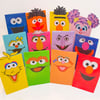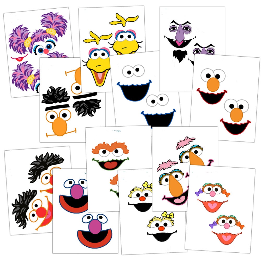 - 12 character faces: Elmo, Bert, Ernie, Cookie Monster, Oscar the Grouch, Big Bird, Grover, Abby Cadabby, Rosita, Zoe, Count, and Telly