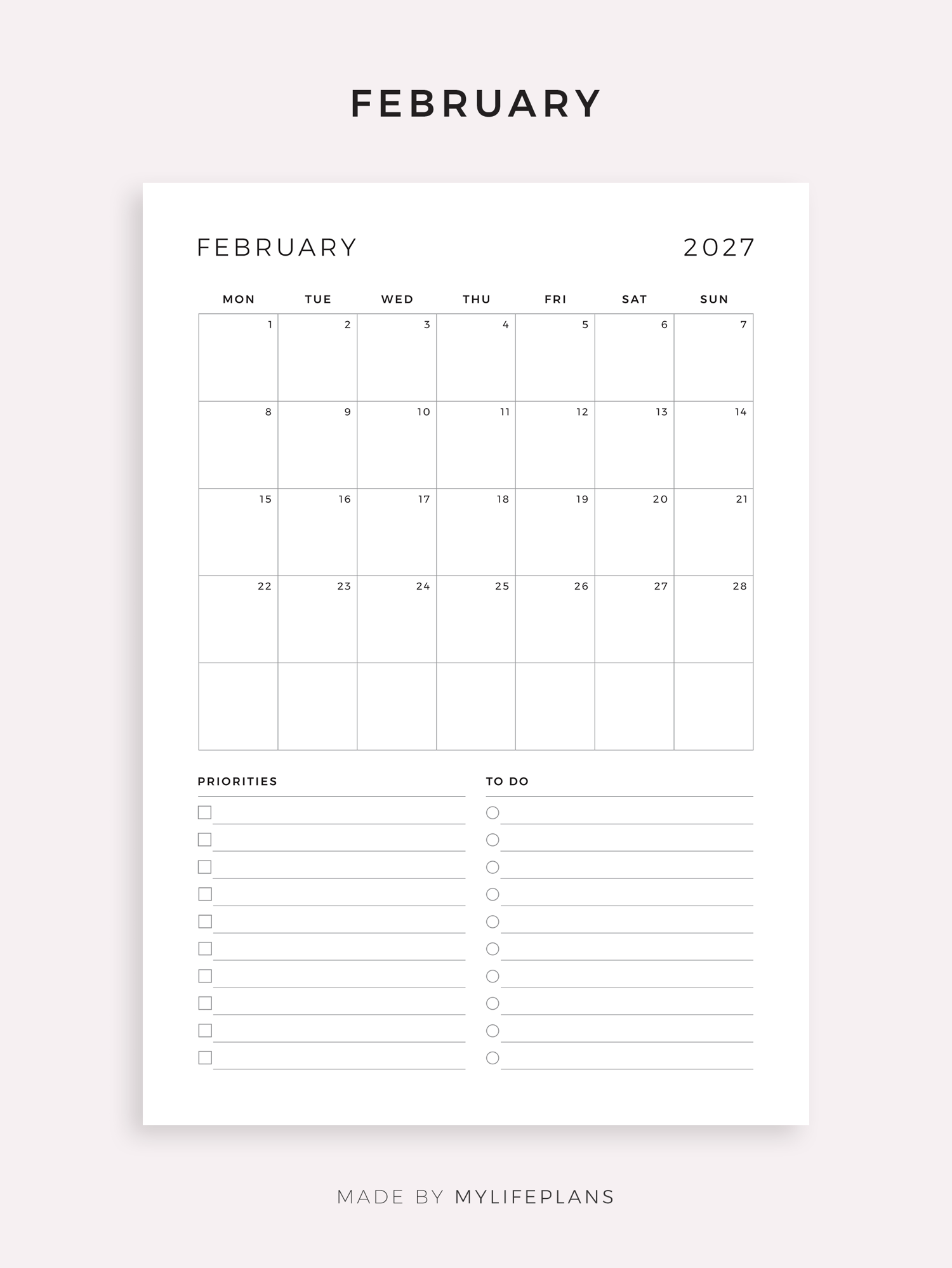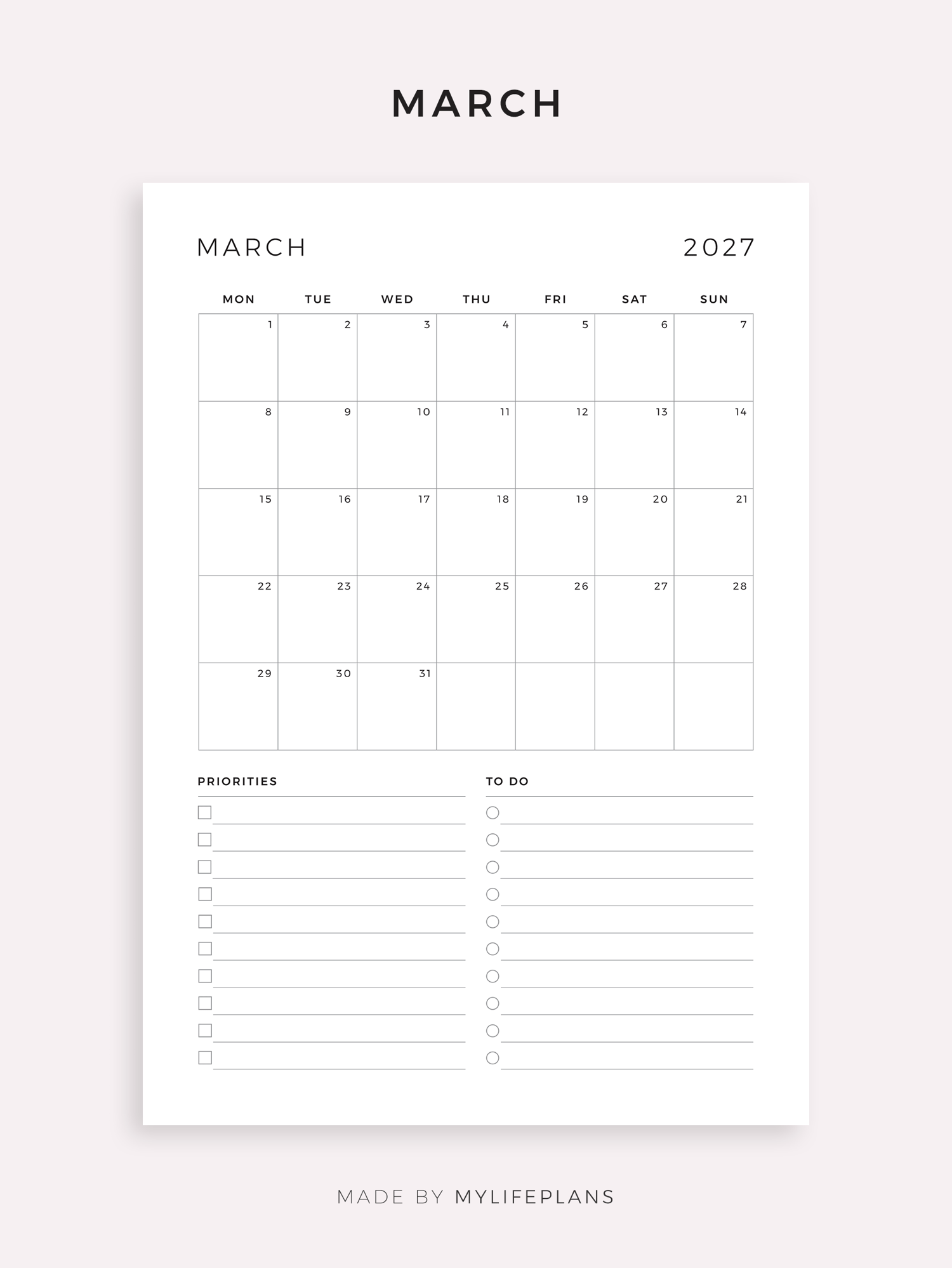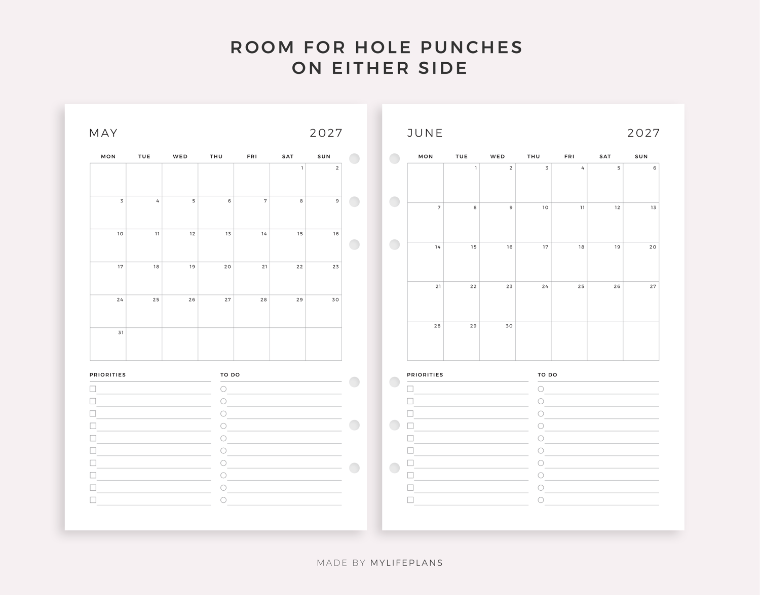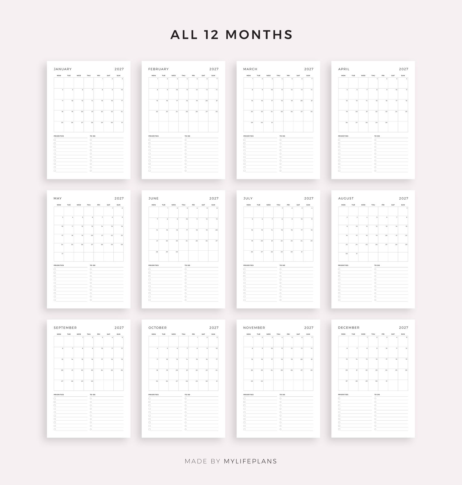This is a printable 2027 monthly planner — just download, print, and start using it right away.