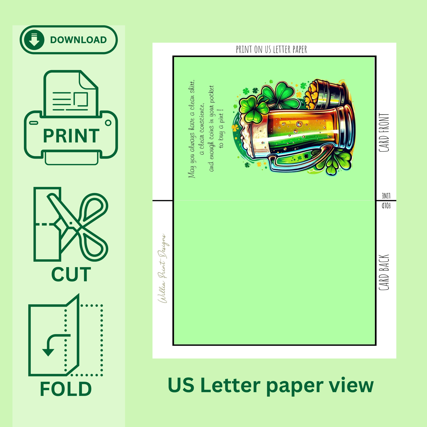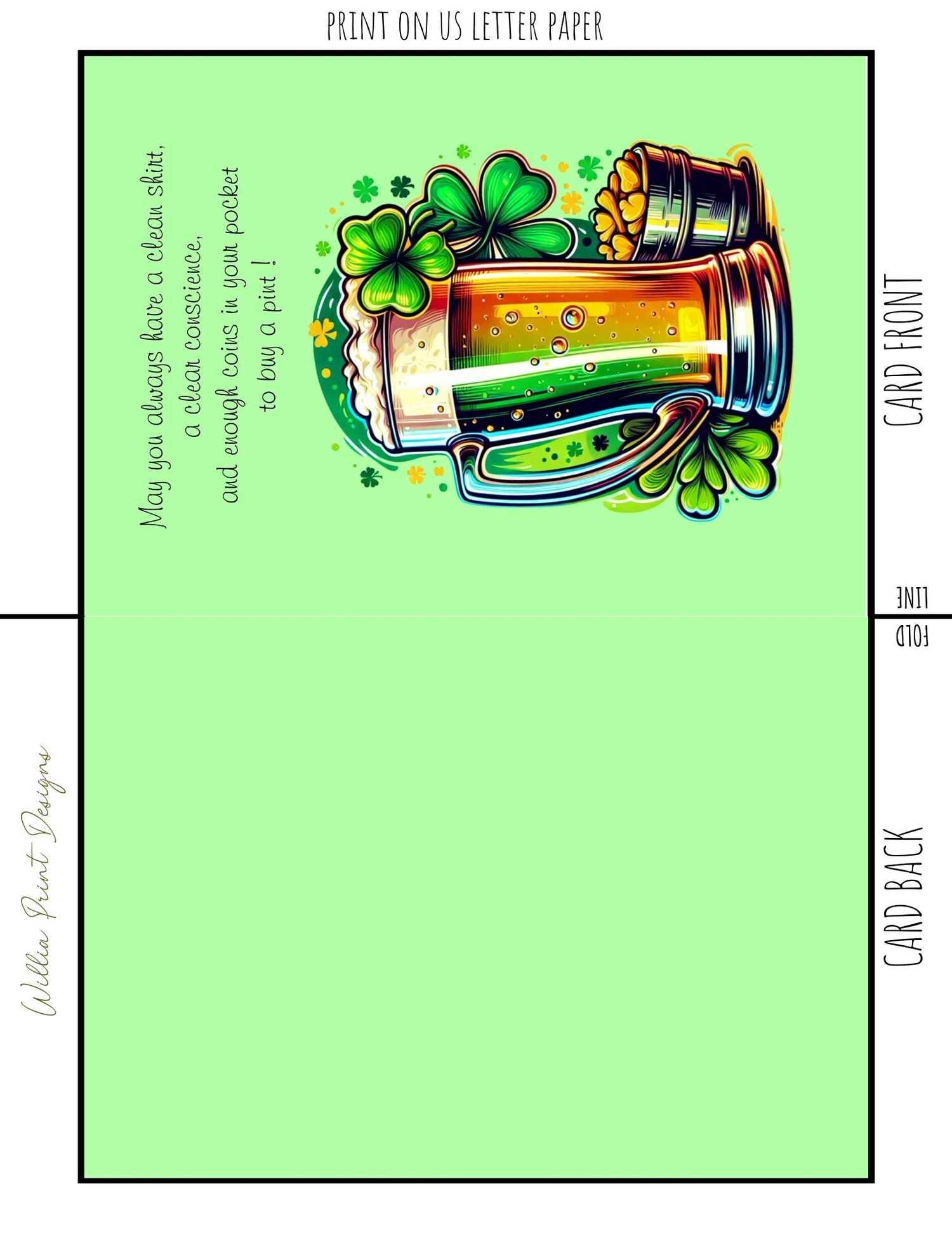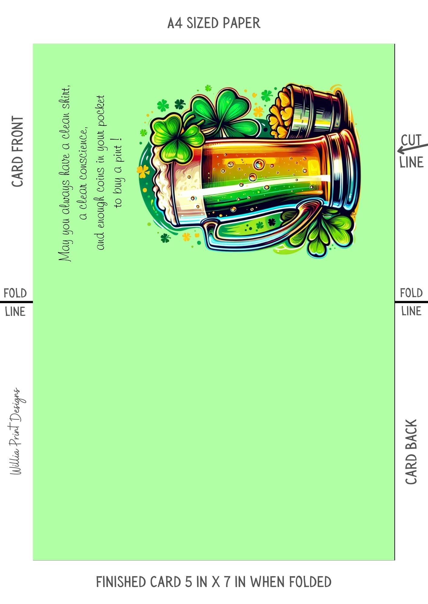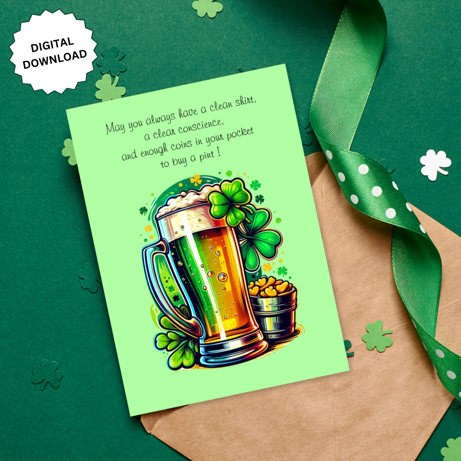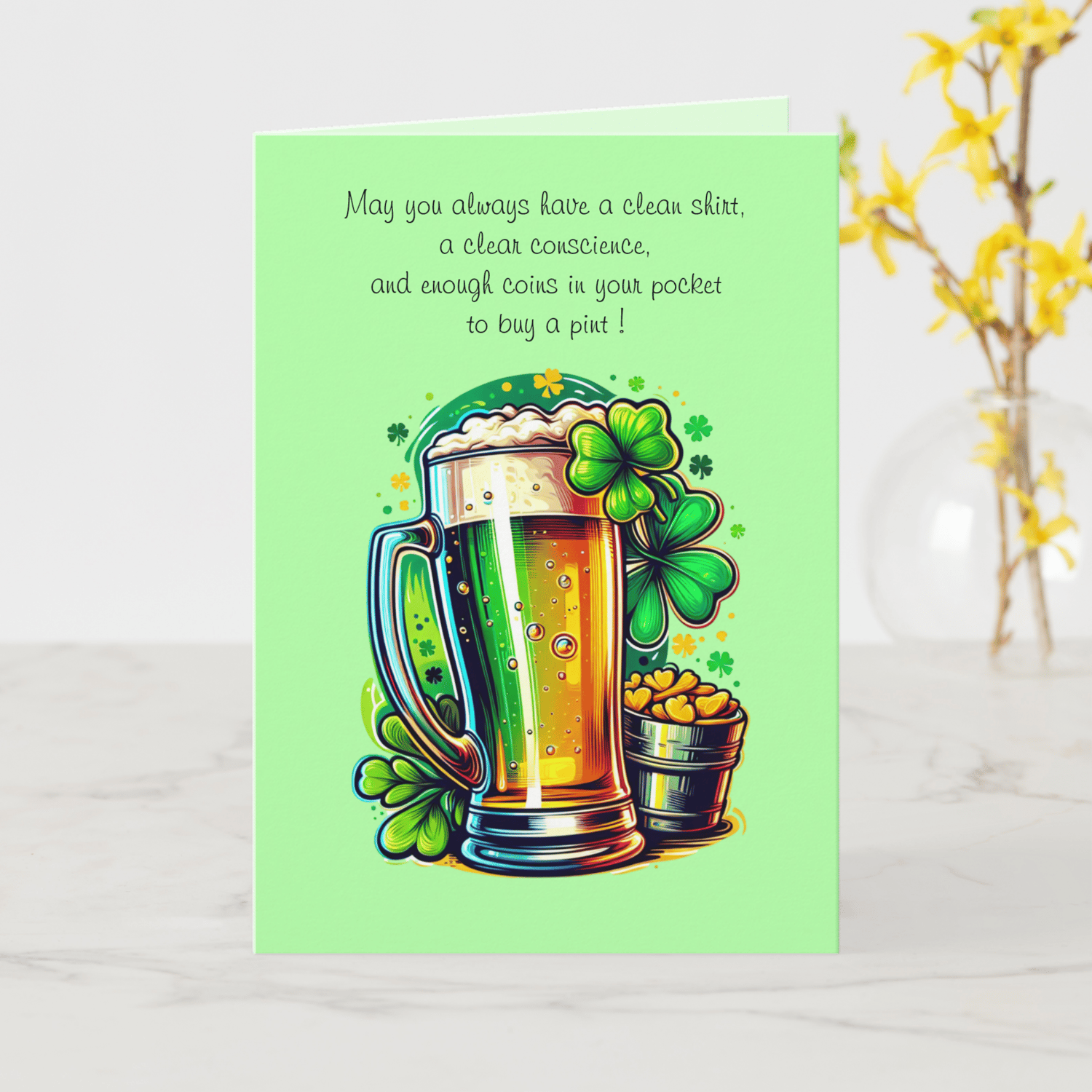 This beautifully designed card features a vibrant graphic of a frothy pint of beer, adorned with green clovers, set against a green background. The card is completed with an authentic Irish Blessing that reads: "May you always have a clean shirt, a clear conscience, and enough coins in your pocket to buy a pint."