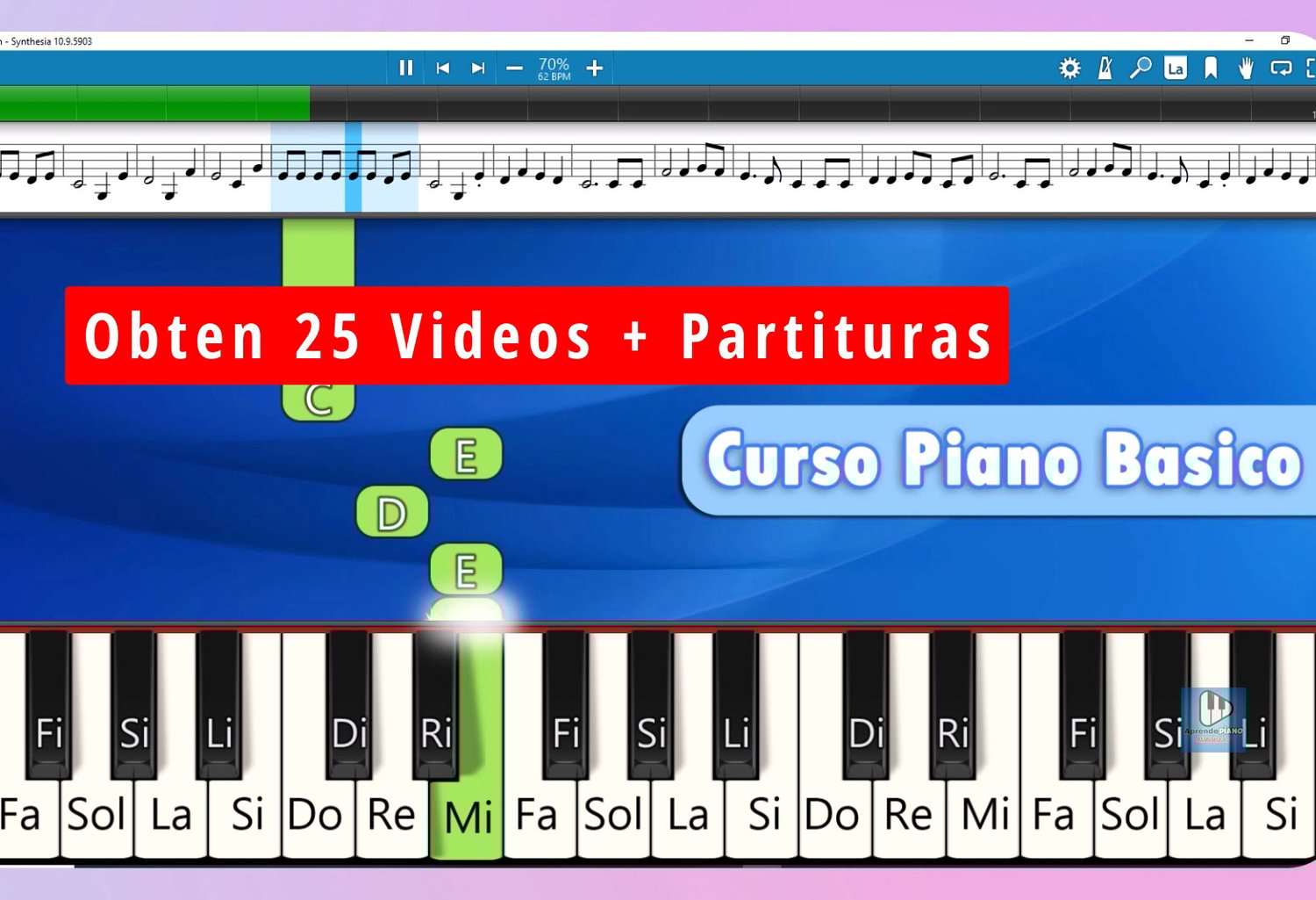 En este material obtienes 25 videos de Melodías en video de manera que puedas aprendértelos y también 23 partituras de complemento para que sigas las notas con nombres faciles de hacer en el piano.