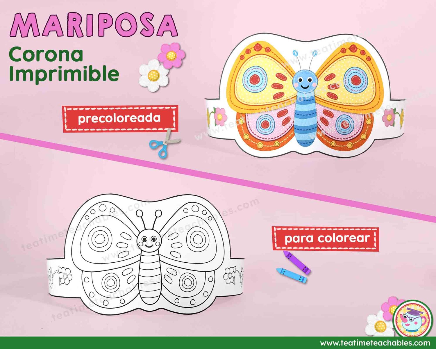 Esta corona de MARIPOSA super linda es muy fácil de hacer para niñ@s pequeñ@s. ¡Simplemente imprime, recorta y monta! Incluye una corona en color lista para recortar y jugar, y una corona en blanco y negro para colorear y decorar.