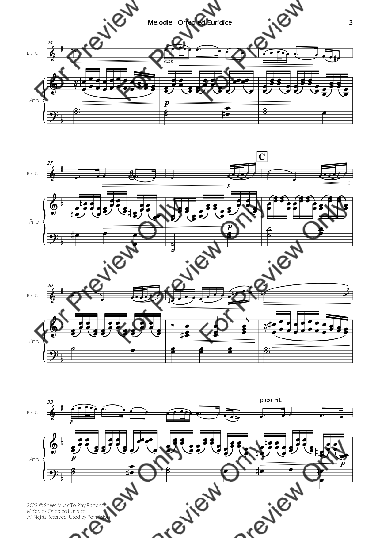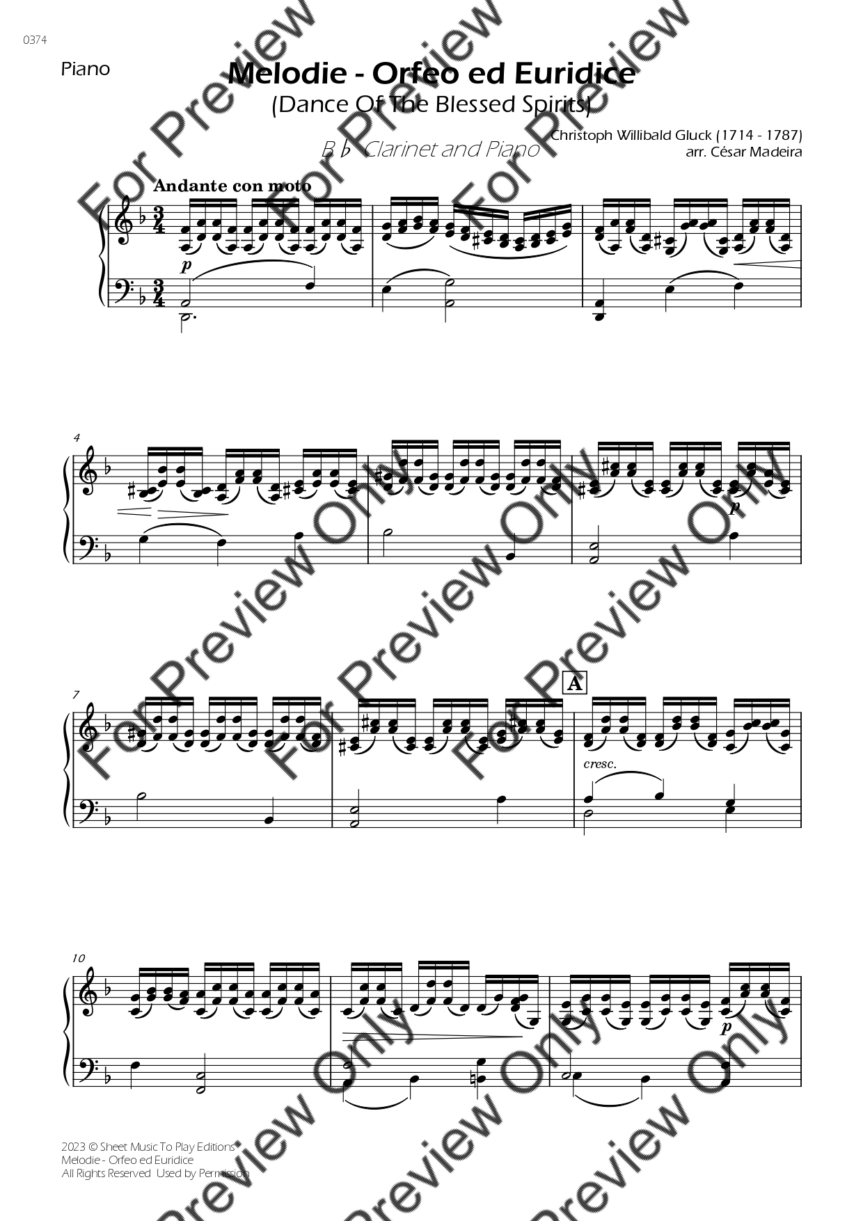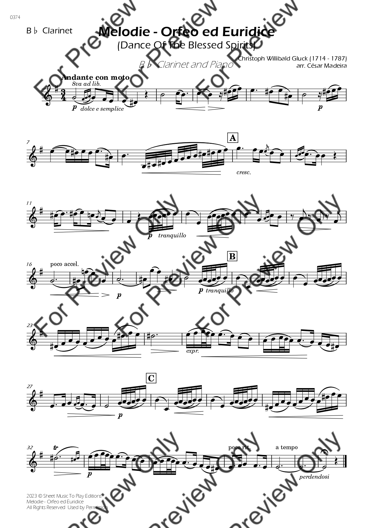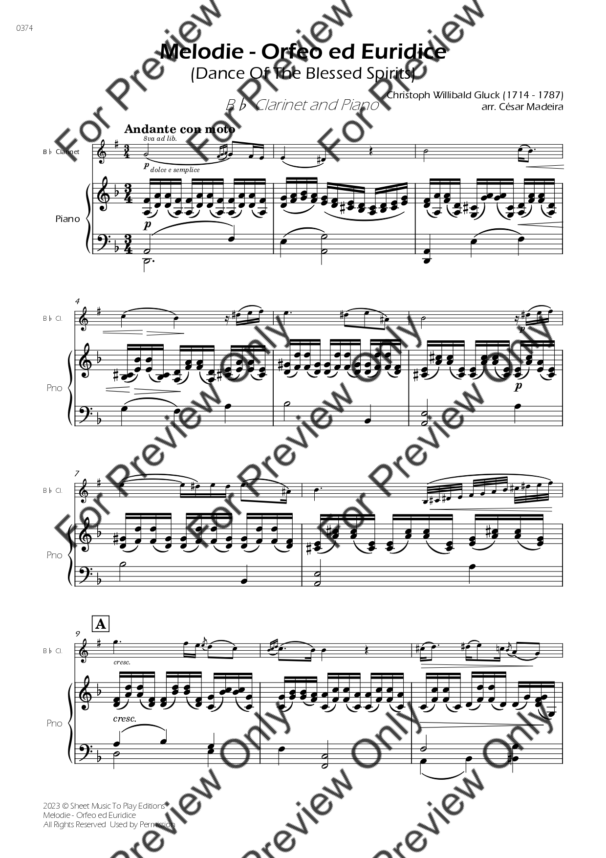 Melodie from Orfeo ed Euridice by Gluck. Arrangement for Bb Clarinet and Piano. With Full Score and Individual Parts. Have fun!