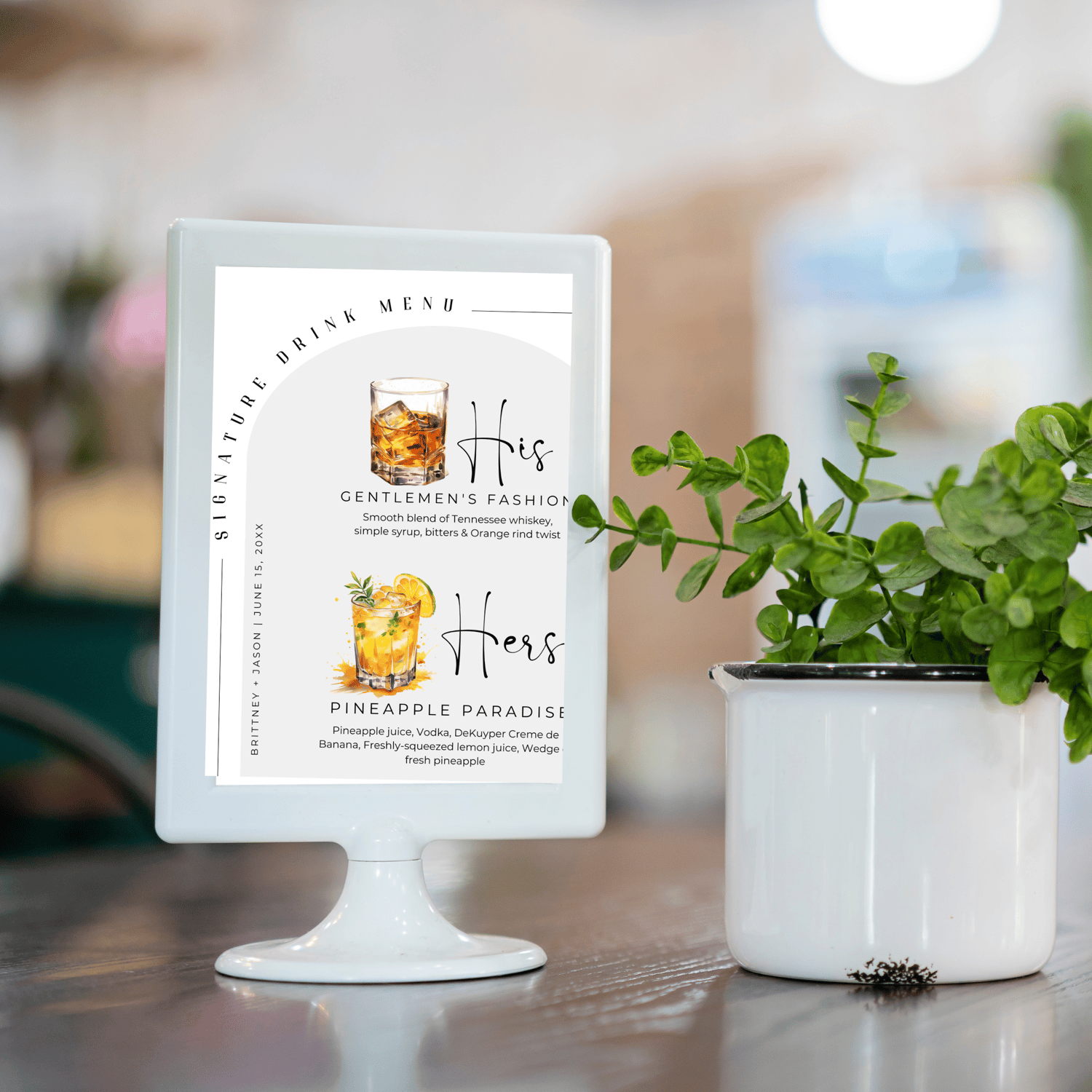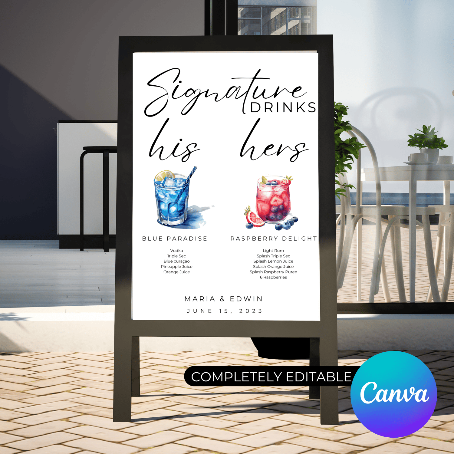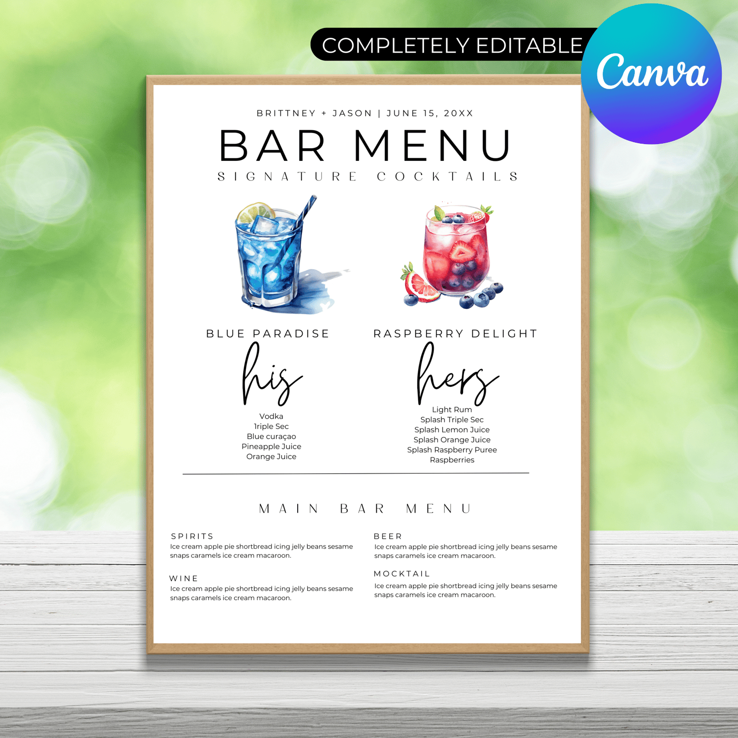 Try this stunning Canva template for crafting a personalized his & her drink menu that will leave your guests thirsting for more! With five versatile layouts to choose from, you can effortlessly design a menu that reflects your unique style. Elevate the experience with 53 captivating watercolor images of cocktails, adding a touch of elegance and flair. Customizable and user-friendly, this template is perfect for bars, restaurants, or special events. Let your creativity flow as you create a menu that sets the tone for an unforgettable beverage experience!