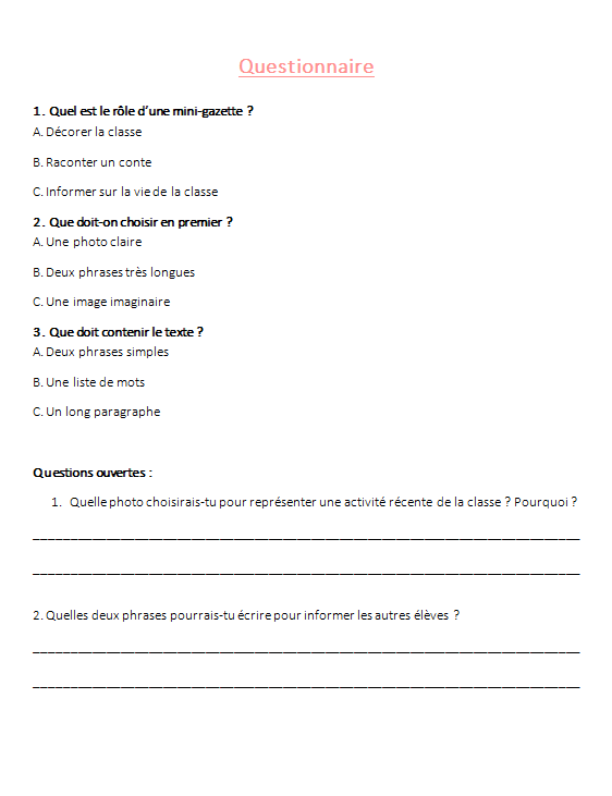 - Un questionnaire élÚve (QCM + questions ouvertes)