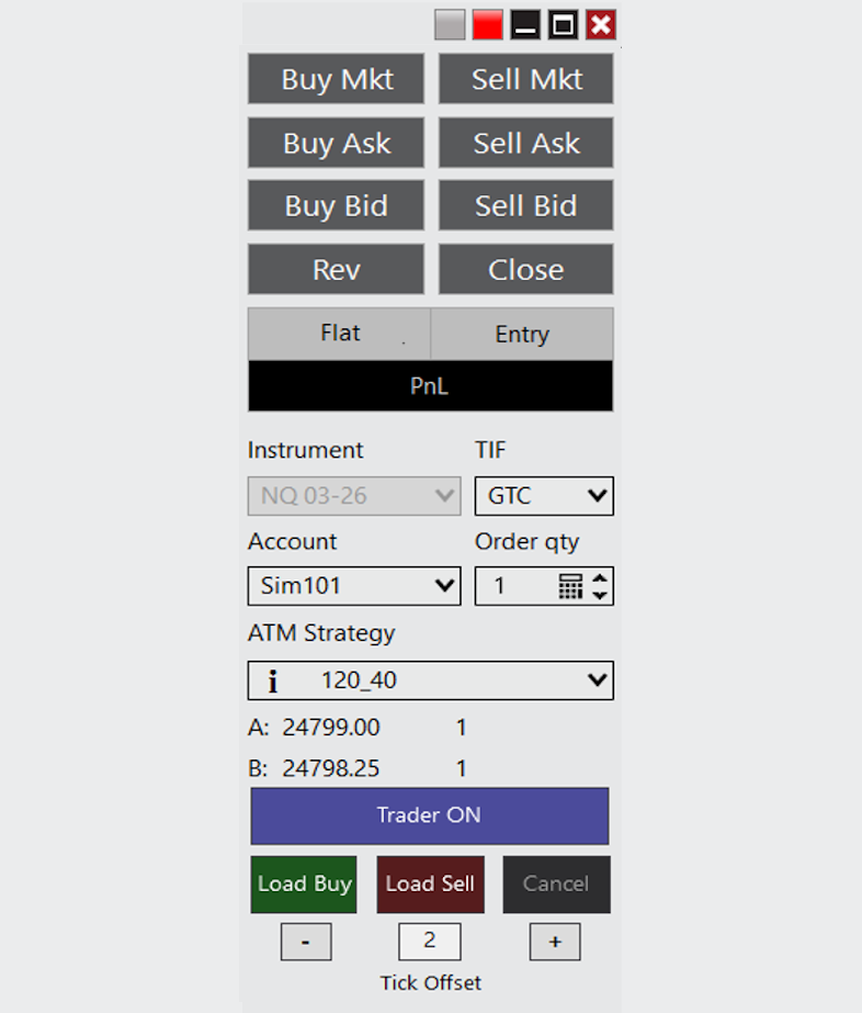Seamless Chart Trader Integration: Loads directly as an indicator—not a strategy—providing uninterrupted access to its functionality without the constraints of fixed strategy conditions. It lives permanently on your Chart Trader panel, ready for immediate use.
