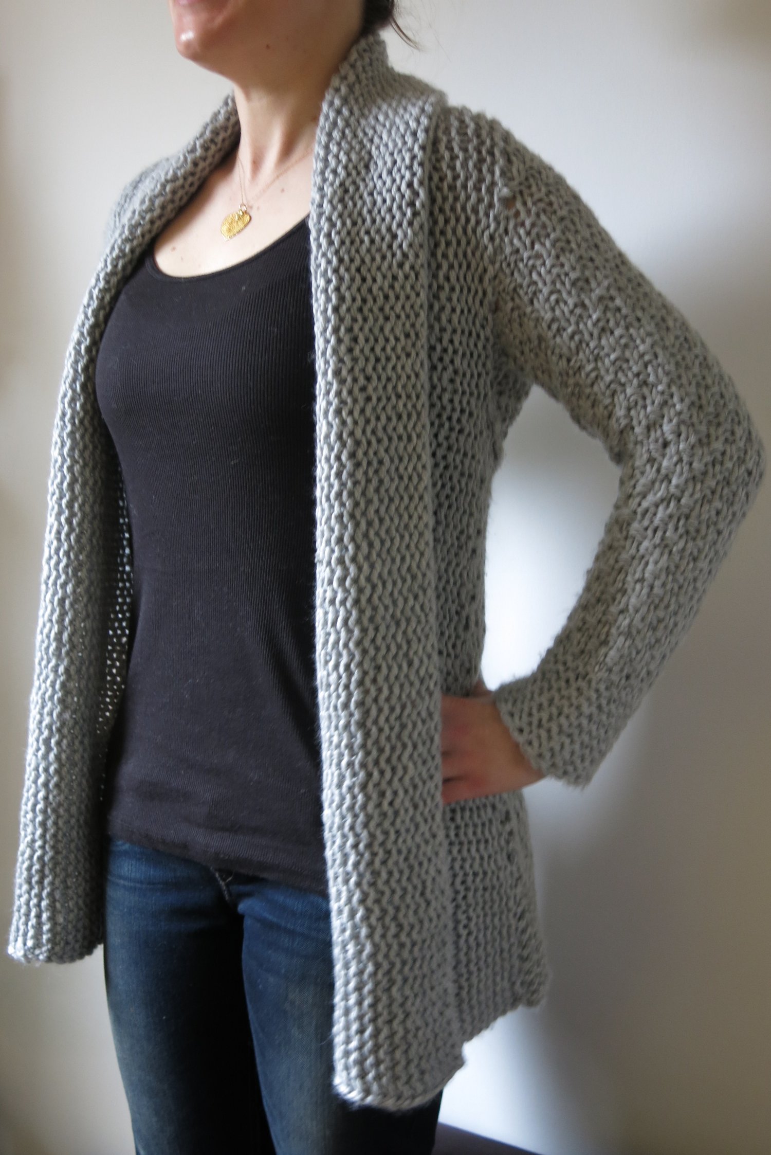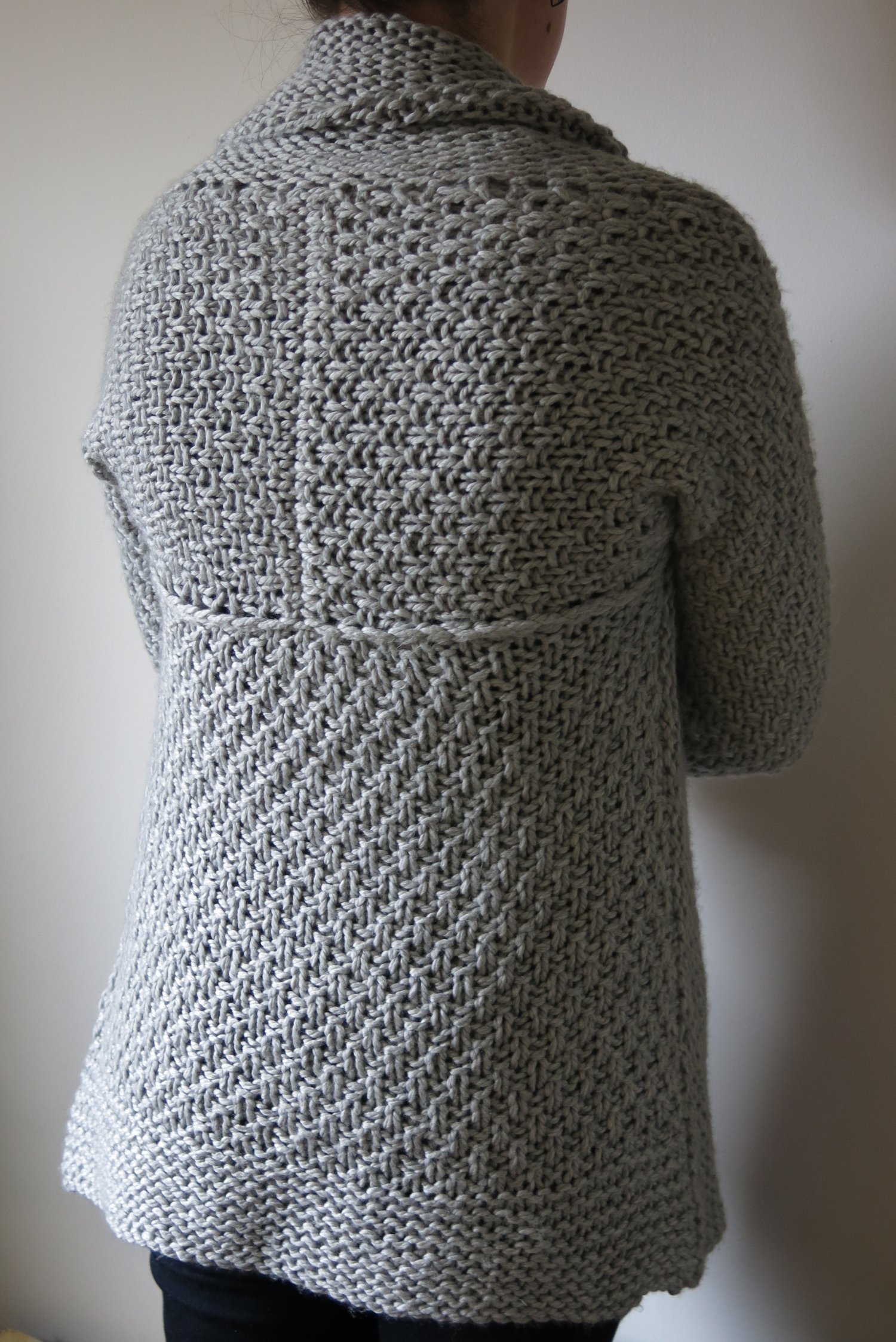 Gauge: 10sts x 17 rows = 4” in Double Moss Stitch after blocking. Note that the weight of the cardigan whilst damp will cause it to stretch out more than a small swatch will.
