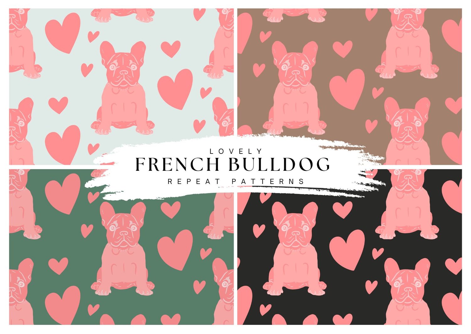 Seamless pattern with lovely French Bulldogs in pastel pink peach on four different backgrounds. Darker sage green, mocha brown, off white pale mint and black. These work as full drop repeat and are 3000x3000 ox with 300 DPI. They are original design, not AI generated.