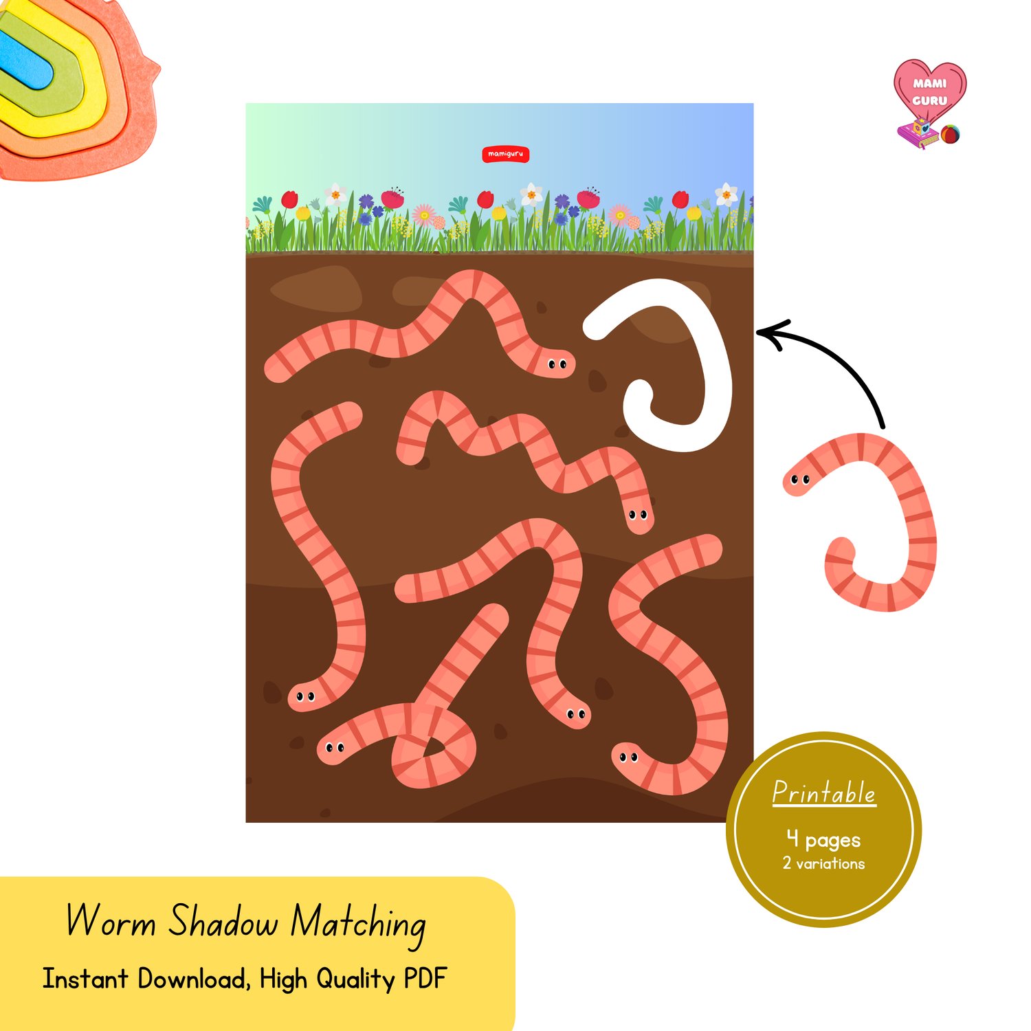 - Shadow Matching Only: Match worm shapes to their shadows using neutral colors (focus on shape)