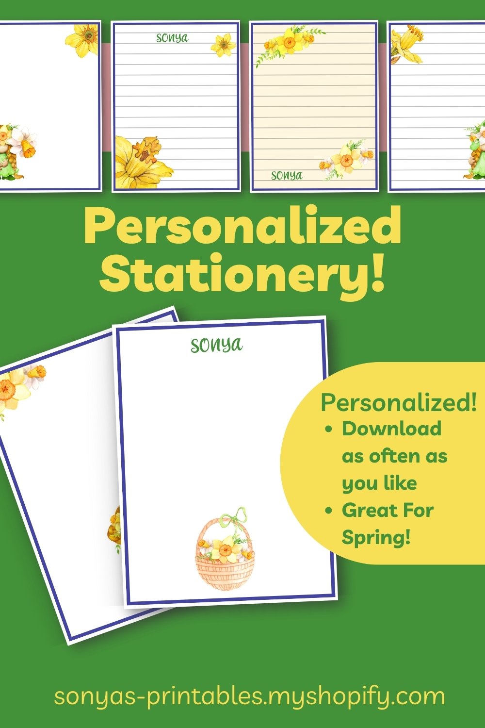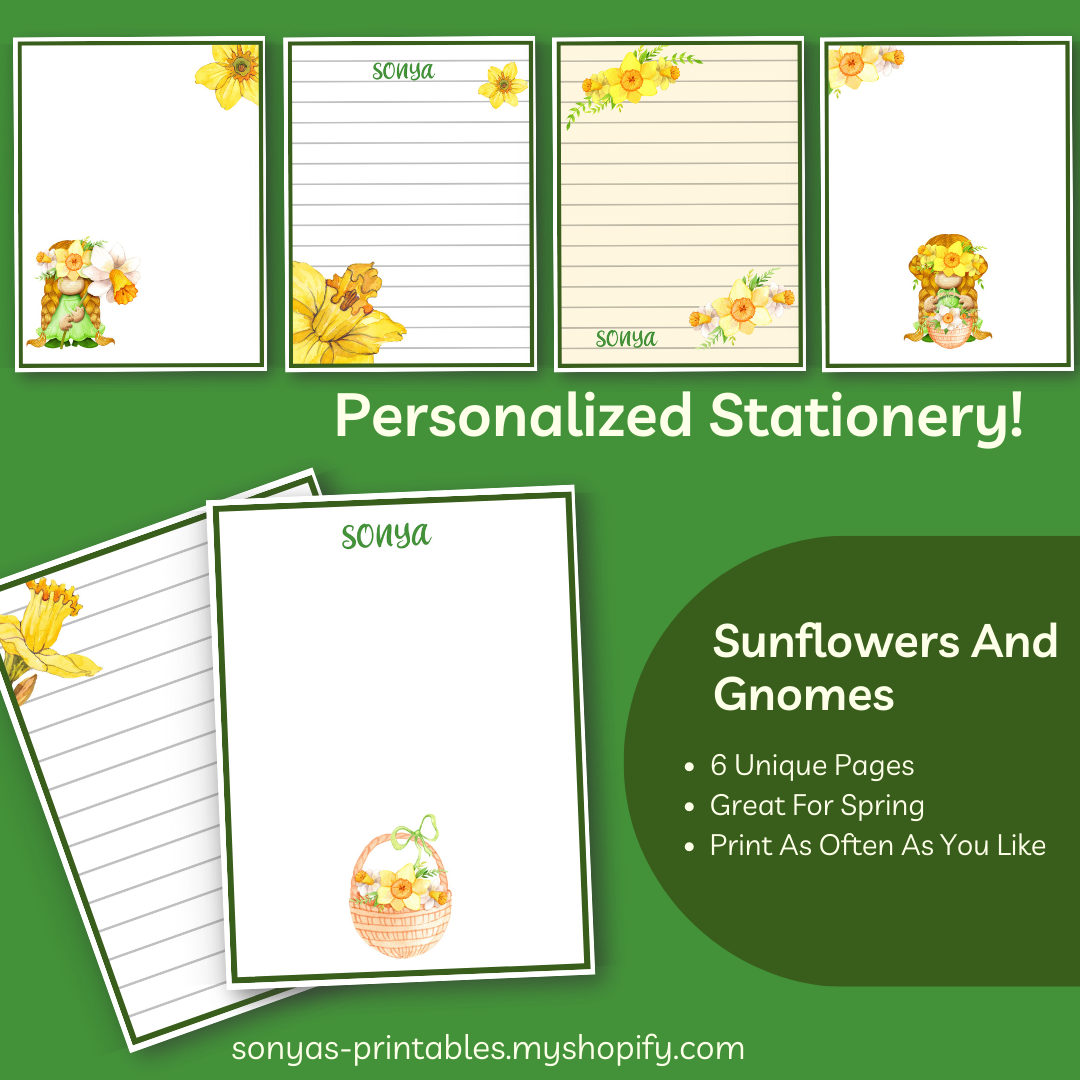Write letters, notes and make lists with your Personalized Gnome And Daffodil Stationery that you can Print Instantly. Your friends and family will LOVE seeing your notes and lists written on these beautiful Personalized Spring Note Papers. Each of the SIX pages are different and eye-catching!