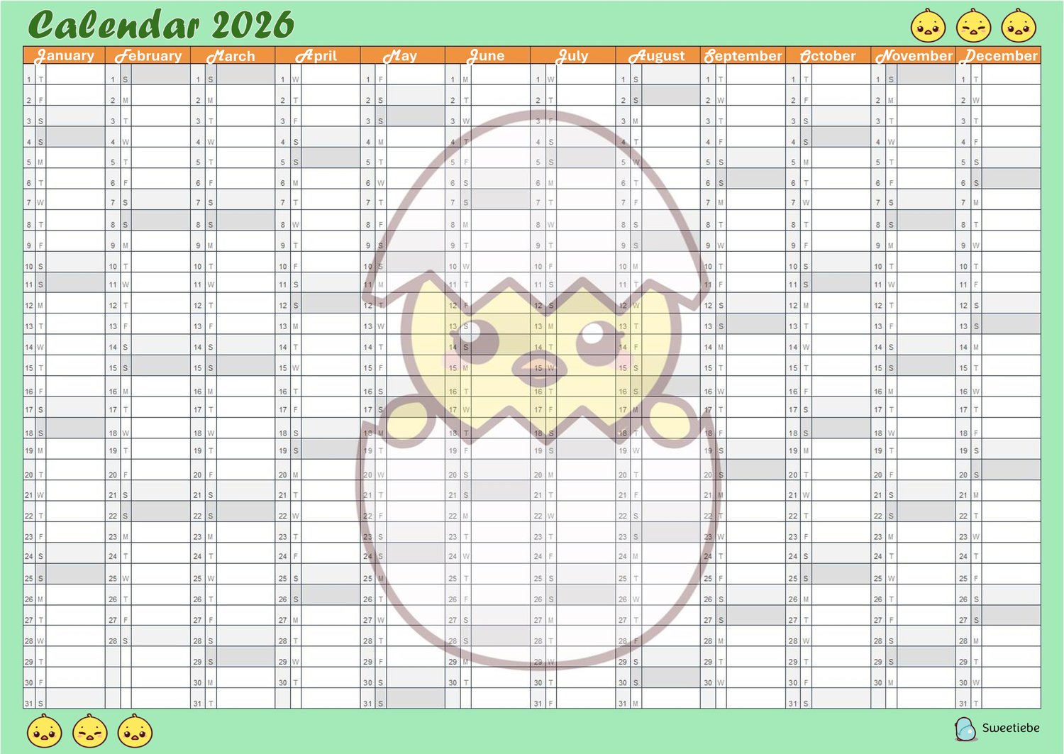 Quack your way through 2026 with this sweet duckling-themed calendar planner! Featuring a delightful little duck hatching from its egg, this single-page design is available as a versatile PDF file for digital use or printing. Whether you use it to organize your year on your devices or display it on your wall, this calendar will bring a smile to your face with its charming design. Perfect for duck enthusiasts, animal lovers, or as a thoughtful gift!