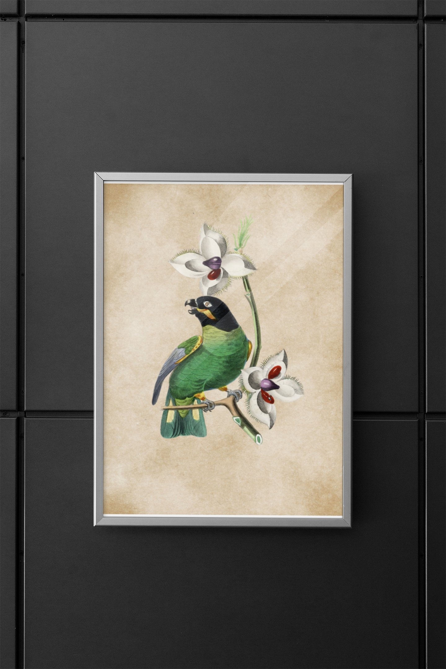 Enhance your decor with this exquisite vintage illustration featuring a green parakeet perched on a branch adorned with delicate orchid flowers. Originally published in a 19th-century natural history book, this artwork captures the intricate details and vibrant colors of this beautiful bird and its floral surroundings. Perfect for nature enthusiasts, bird lovers, and vintage art collectors, this piece adds a touch of historical charm and natural beauty to any home or office space.
