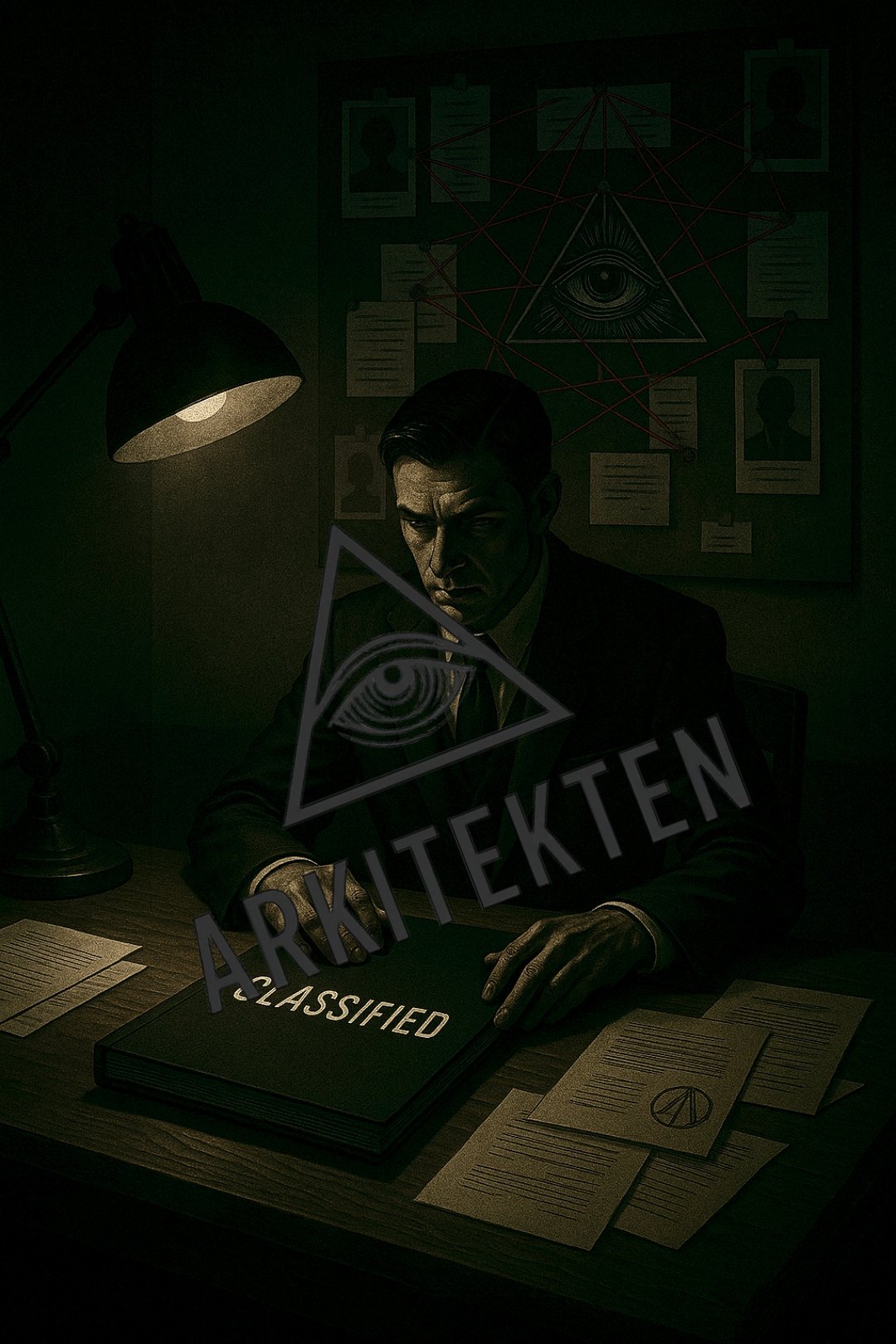 En mand i mørkt jakkesæt sidder alene ved et skrivebord, kun oplyst af en lampe, mens han studerer en mappe mærket ‘CLASSIFIED’. Bag ham afsløres et konspiratorisk net af røde tråde, billeder og symboler. Et intenst billede, der indfanger følelsen af hemmeligheder, magt og skjulte sandheder – perfekt som wallpaper til dig, der lever mellem linjerne.