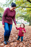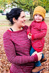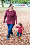 Sample shown in Mon Sheep Shop in the Petit Pieds base (75/25 Superwash Merino/Nylon) in the Terre Brulee (Main Colour / MC) & Liqueur D’Epine Noire (Contrast Colour / CC) colourways (425m/100gm). The sample pullover is shown in the 44 inch size, modeled with 0-1” of positive ease.