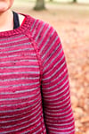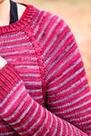 You will use two colours (or more if you wish) of fingering weight yarn to create these stripes, and then with the added detail of the cables in the Raglan area which continue down in the body, and then start to travel in towards the middle towards the bottom mimicking the Raglan shaping at the top. This sweater remains engaging without having an overwhelming amount of instructions to keep track of.