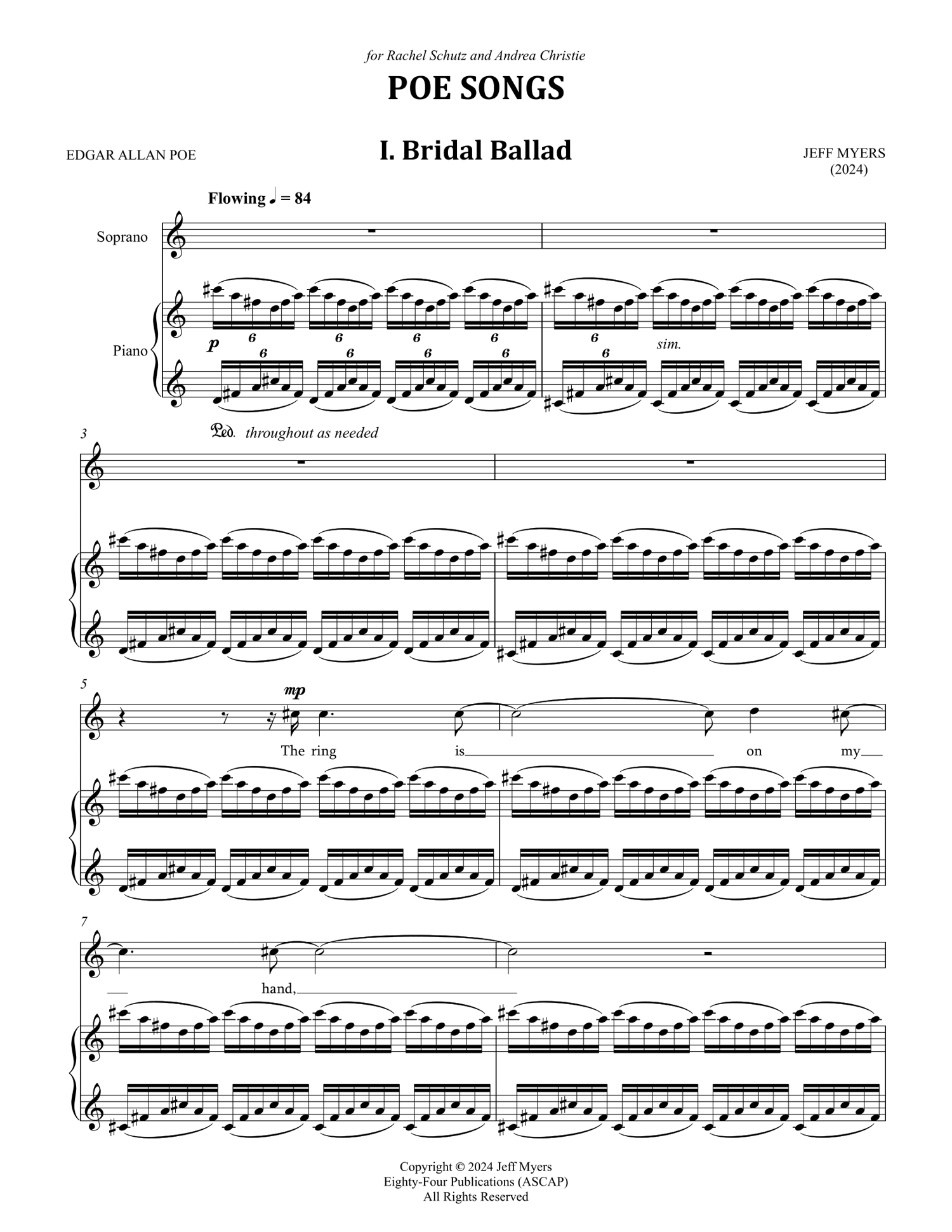 Poe's legacy endures in the psychological depth and eerie beauty of his work, which inspired me to write these songs so full of romance and despair. The Poe Songs songs were premiered by soprano Rachel Schutz and pianist Andrea Christie at Ithaca College on February 23, 2025. The songs will be released on an album of vocal music with the same collaborators at a future date.