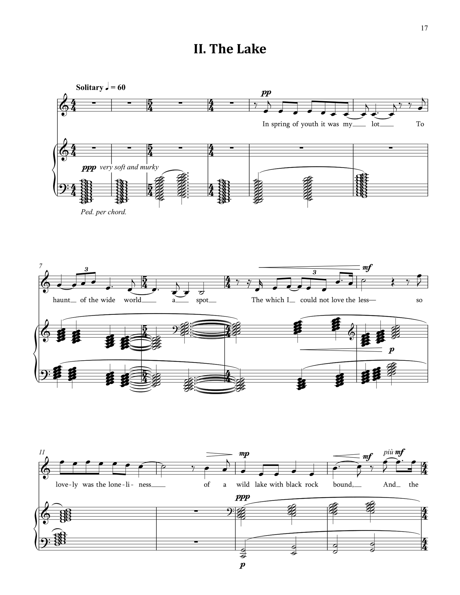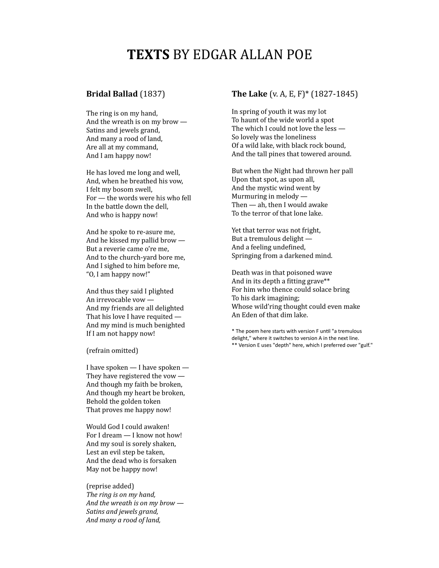 The five poems in the Poe Songs chart a timeline in the life of the American poet Edgar Allan Poe. Orphaned early, he was fostered by the wealthy merchant John Allan and his wife Frances. His strained relationship with John worsened after gambling debts forced him out of the University of Virginia. After the death of his foster mother in 1829, he wrote Alone, reflecting on his isolation and foreshadowing his tragic life. An early poem, it was placed it at the end of the cycle as a kind of prequel, foreshadowing his troubled life. Poe later joined the Army, publishing Tamerlane and Other Poems, which included The Lake, a piece rich with Poe’s signature darkness.