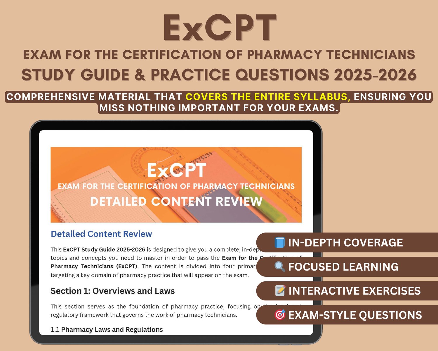 ✅ Comprehensive Content Review: Dive deep into Overviews and Laws, Drugs and Drug Therapy, Dispensing Process, and Medication Safety and Quality Assurance.