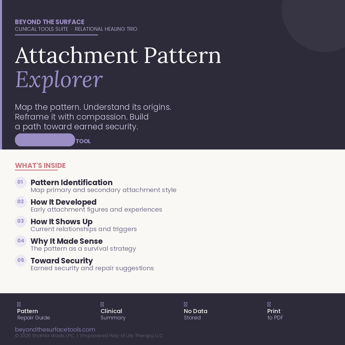 Most therapists know their client has an attachment wound. This tool helps you actually map it, understand where it came from, and build a clinical path toward earned security not just label the style.
