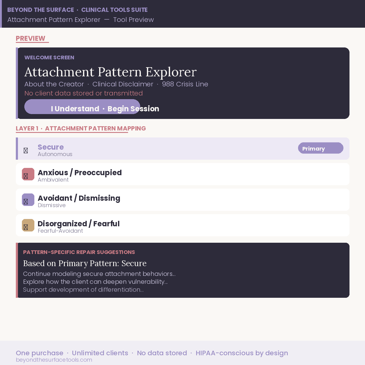 The Attachment Pattern Explorer is a therapist-facing interactive clinical tool built for relational and trauma-informed work.