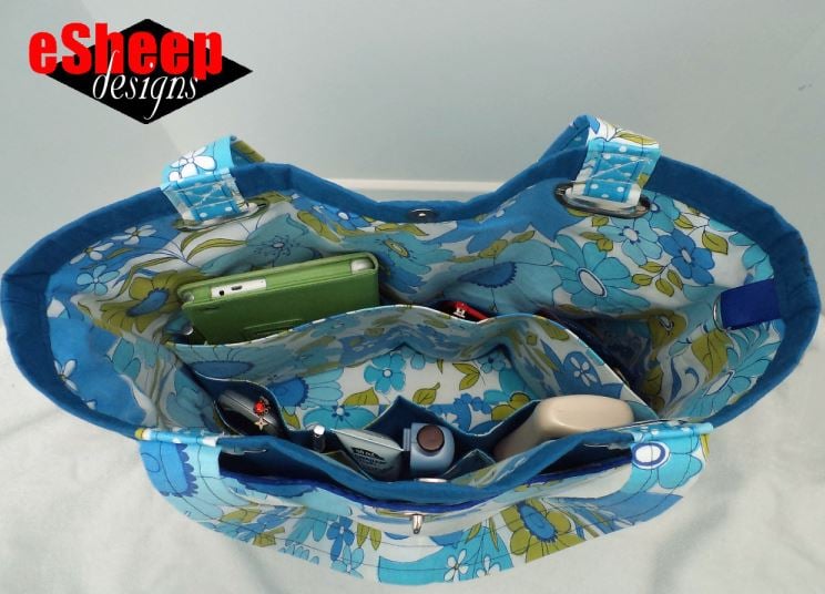 The organizer is circular, with one half able to hold larger objects and the other half being the original WPO. The center area is open to hold what your tote bag needs to hold. This design keeps the contents of the organizer against the interior lining of the bag, pretty much as if you had regular pockets, only these ones are removable.