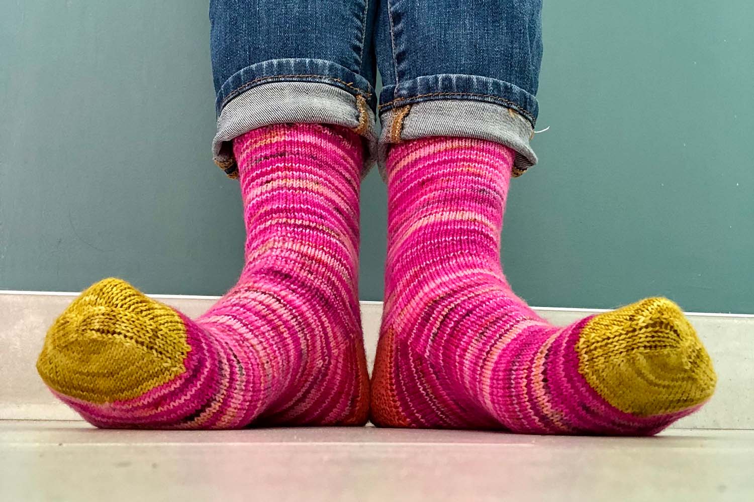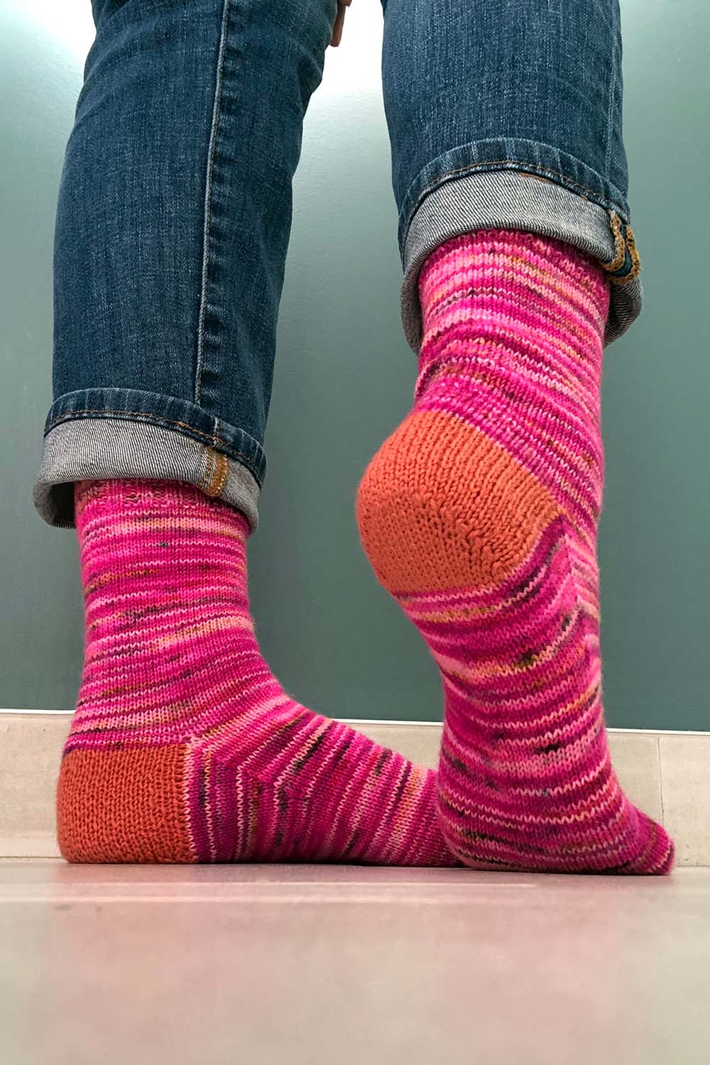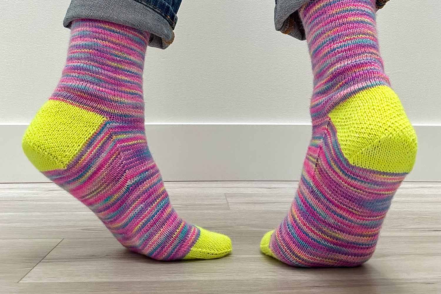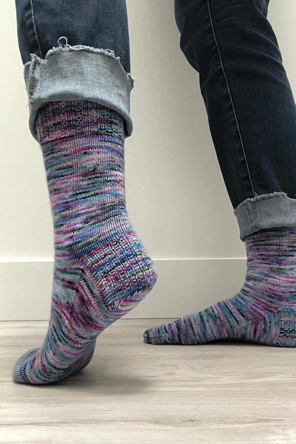 The generous yardage specified is for a 9 ½" (24 cm) foot (shoe size US Women's 9/Men's 8, UK 7.5, EUR 41). Optional contrasting-coloured heels, toes, and cuffs require about 20-25% of the total sock yardage.