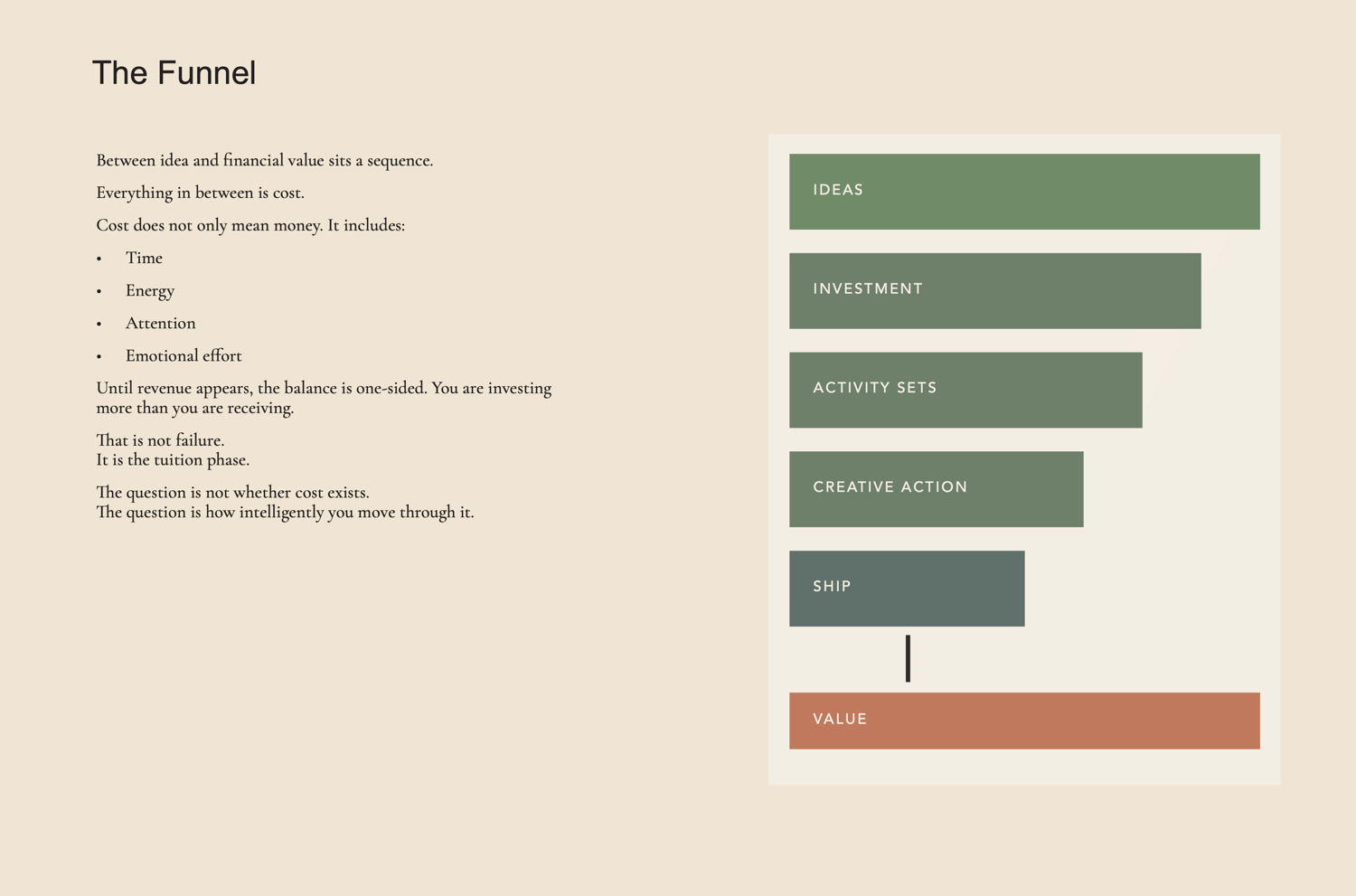 It is a clear way of understanding how ideas move from imagination to income — and how to survive the early, expensive phase long enough for something stable to form.